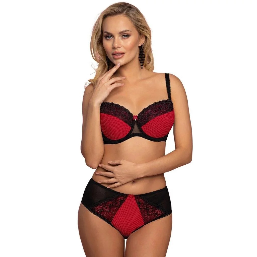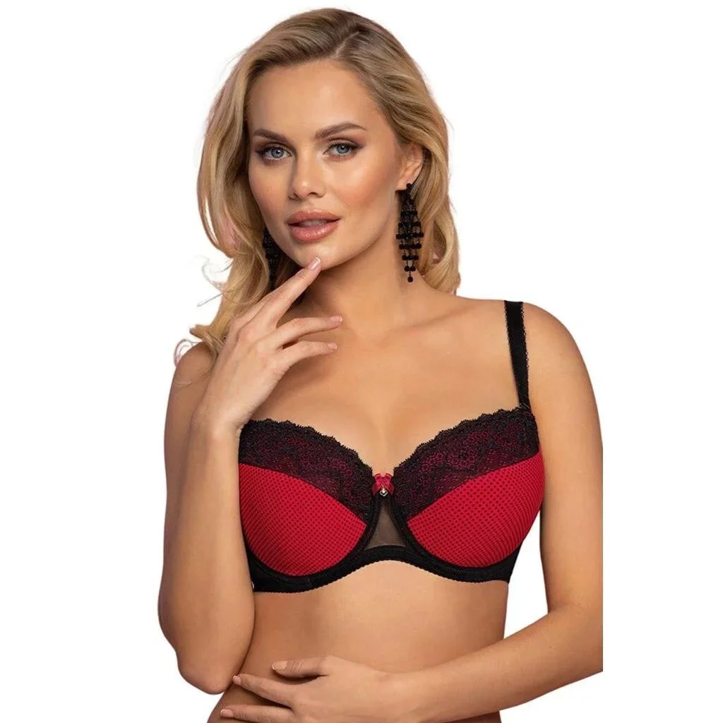 Elegantní vyztužená podprsenka z červeného úpletu s jemným potiskem černých teček a pěkně zdobenou černou krajkou. Síťovaný můstek, mašlička mezi košíčky s visačkou, nastavitelná, odepínací ramínka. Zadní díl z elastické síťoviny, zapínání na háčky a očka.