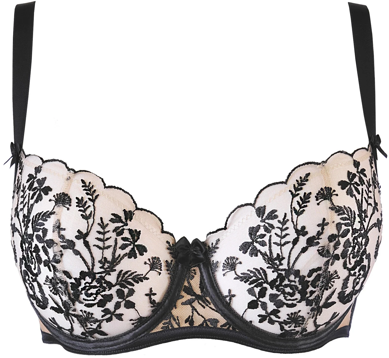Květinová černá výšivka na naší měkké podprsence je velmi elegantní a klasický motiv, díky kterému budete vypadat fenomenálně. Tento model je velmi univerzální a hodí se jak na každodenní, tak na večerní vycházky. Podprsenka má zabudovanou kostici a boční klíny, košíčky jsou zajištěny přídavným silikonovým páskem, aby vše zůstalo na svém místě, když jste v pohybu. Model má neodnímatelná, nastavitelná ramínka a zapínání na dva háčky, doplňky jsou ve zlaté barvě.