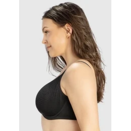 Dámská bezešvá podprsenka s kosticemi od americké značky PARFAIT. Tato podprsenka má nevyztužené košíčky střižené z jedné části, uvnitř jsou všité elastické pásky pro podporu prsou. Vnější část košíčku je pošitá jemnou krajkou. Podprsenka má vyšší střed, kostice a pružnou a výborně zpracovanou dekoltovou část a obvod dostatečně pevný a přitom pružný, což jsou atributy, které z ní tvoří velmi dobře fungující celodenní model. Ramínka vychází z dekoltové části, jsou nastavitelná a pevně všitá. Design je v barvě černé, velmi decentní a jemný, kombinace s geometrickou krajkou působí elegantní zdobnost. Materiálové složení: 85% polyamid 15% elastan
