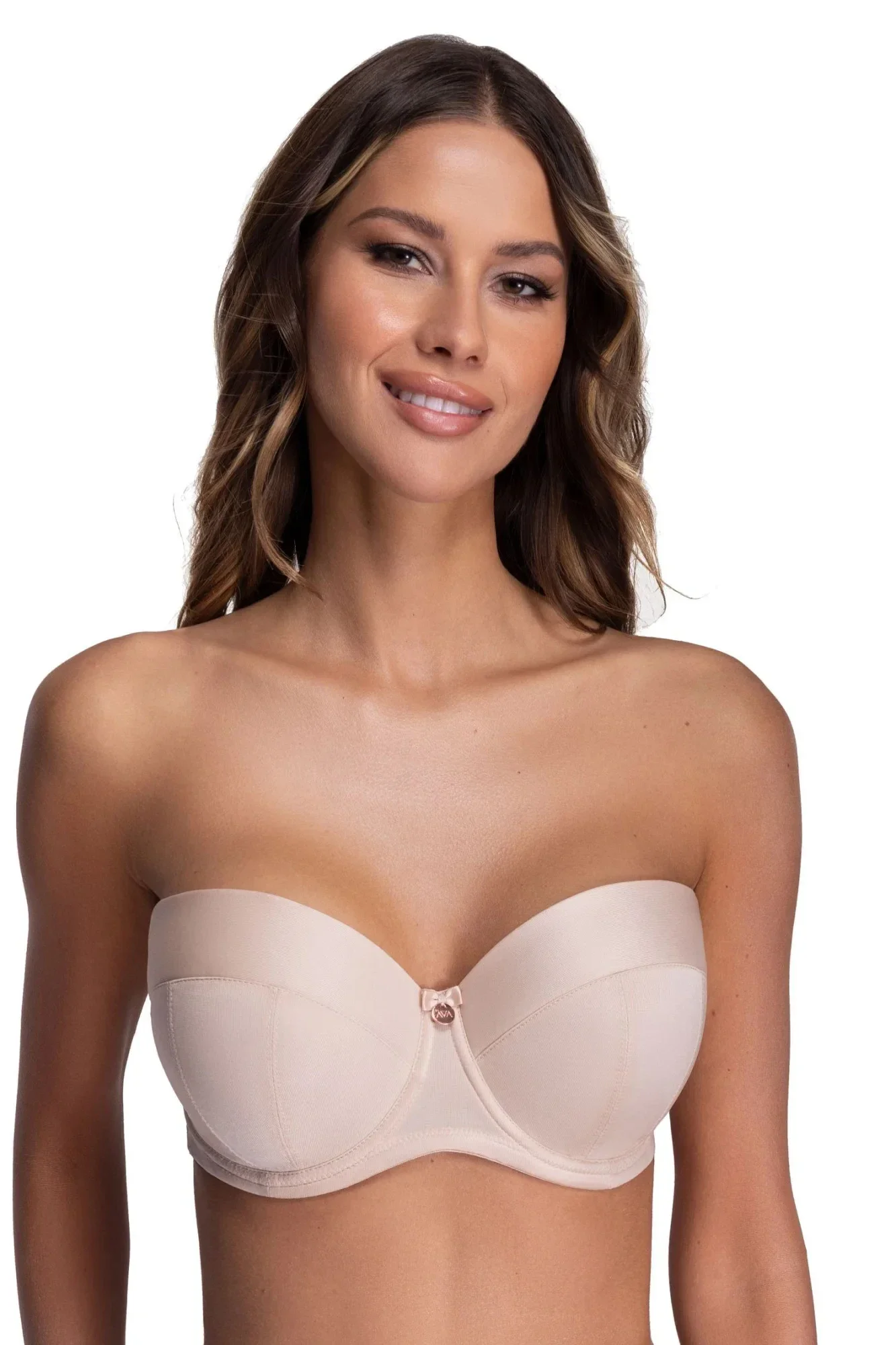 Dámská podprsenka 1787 Last night beige plus AVA - béžová barva - typ bardotka - vyztužené košíčky vyrobené z hladké látky - zadní část z pružné síťoviny - mezi košíčky je umístěná mašlička s elegantním přívěskem - svislé kostice - uvnitř podprsenky se táhne silikonová páska - ramínka je možné nastavit i odepnout - šířka ramínek je přizpůsobená velikosti a rozměru podprsenky - model je možné nosit i bez ramínek - podprsenka ve velikostech push-up se zapíná dvouřadovými háčky s trojí možností nastavení délky obvodu - ve velikosti maxi se model zapíná pětiřadovými háčky s trojí možností nastavení obvodu