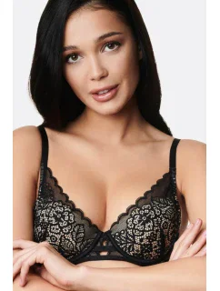 Dámská podprsenka značky Novika. Podprsenka je lehce vyztužená s push up vycpávkami. Celá podprsenka je ušitá z příjemného a pružného tylu s leopardím vzorem. Obvod kostic je obšitý saténovým páskem, který je prošitý zlatou nití. Košíčky jsou podšité bavlněnou látkou proti průhlednosti. V košíčcích jsou vložené vycpávky, které dělají podprsenku push up, vycpávky lze vyndat. Nad košíčky v oblati hrudníku jsou našité pružné pásky na kterých je zlatá ozdoba s motivem leopardích hlav. Podprsenka má uzší ramínka, která se dají délkově nastavit. Zapínání je na dva háčky a tři pozice.