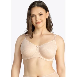 Dámská bezešvá podprsenka s kosticemi od americké značky PARFAIT. Tato podprsenka má nevyztužené košíčky střižené z jedné části, uvnitř jsou všité elastické pásky pro podporu prsou. Vnější část košíčku je pošitá jemnou krajkou. Podprsenka má vyšší střed, kostice a pružnou a výborně zpracovanou dekoltovou část a obvod dostatečně pevný a přitom pružný, což jsou atributy, které z ní tvoří velmi dobře fungující celodenní model. Ramínka vychází z dekoltové části, jsou nastavitelná a pevně všitá. Design je v barvě cameo rose, velmi decentní a jemný, kombinace s geometrickou krajkou působí elegantní zdobnost. Materiálové složení: 85% polyamid 15% elastan
