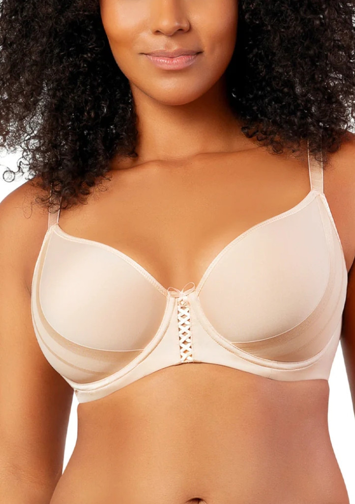 Dámská podprsenka od americké značky Parfait. Podprsenka má jemně vyztužené košíčky s všitou poloviční podšívkou na podporu prsou. Vnější část košíčků zdobí jemná krajka a střed všitá šňůrka. Ramínka jsou pevně všitá, nastavitelná. Zapínání je na 2 háčky a 3 pozice.