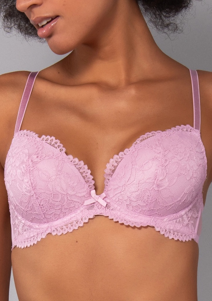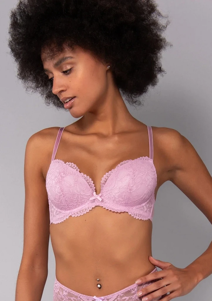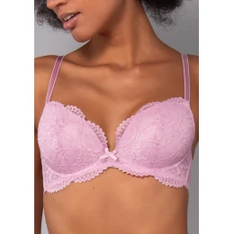 Tato vyztužená podprsenka italské značky je potažená květinovou krajkou a zdobená elegantním vroubkovaným lemem, který zdobí košíčky a poprsí. Kostice obepíná prsa, poskytuje jim oporu a zdůrazňuje dekolt, zatímco vyztužení zajišťuje harmonický tvar. Jemná saténová mašle uprostřed poprsí dotváří design a dodává tomuto kousku romantický a rafinovaný nádech.