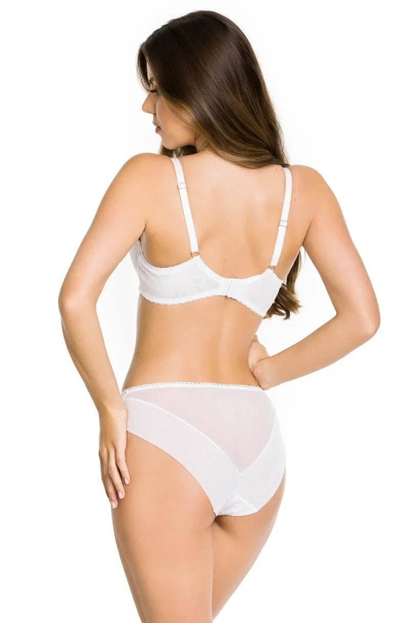 Podprsenka, jejíž košíčky dokonale nadnáší středně velké a velké poprsí. Spodní část košíčků je vyrobená z pěny pokryté vytlačovanou vzorovanou tkaninou. Vrchní část košíčků tvoří jemná krajka podšitá tylem a olemovaná gumičkou. Košíčky jsou uvnitř pokryté bavlnou. Délku pohodlných a komfortních ramínek je možné nastavit. Šířka ramínek je přizpůsobená velikosti a rozměru košíčků a délce obvodu. Můstek je ušitý z krajky. Obvod podprsenky tvoří mikrovlákno. Model nemá boční kostice.