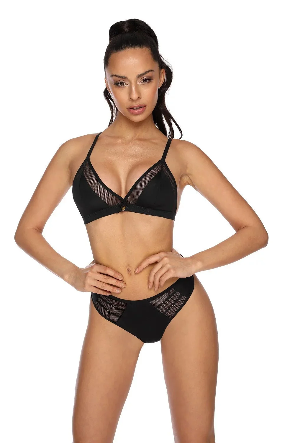 Košíčky modelu jsou vyrobené z černého mikrovlákna a jemné síťoviny. Vrchní část lemuje širší pružná guma. Úzká ramínka není možné odepnout. Na zádech je jednostupňové zapínání na tři háčky.