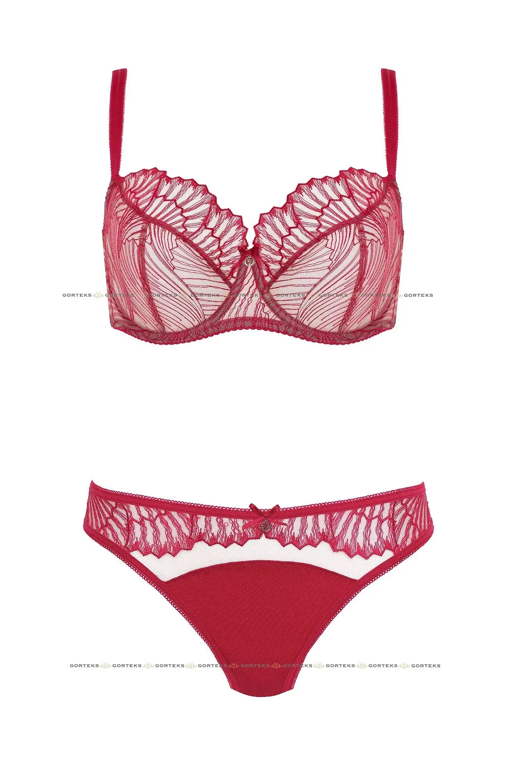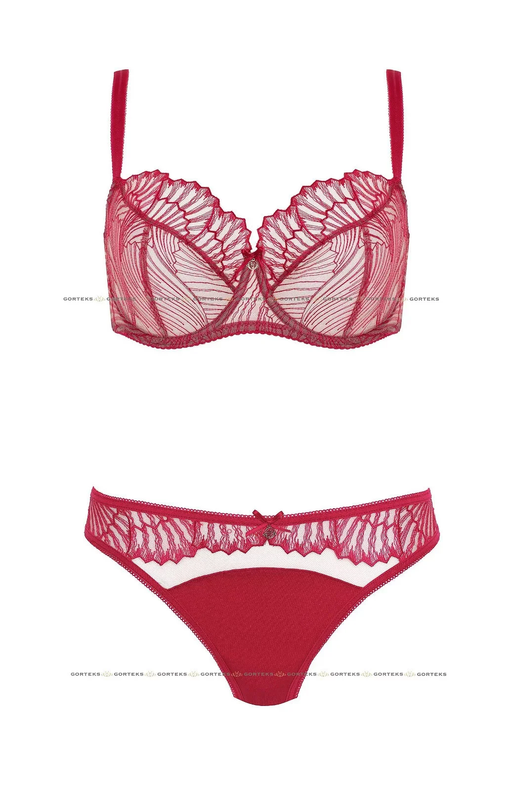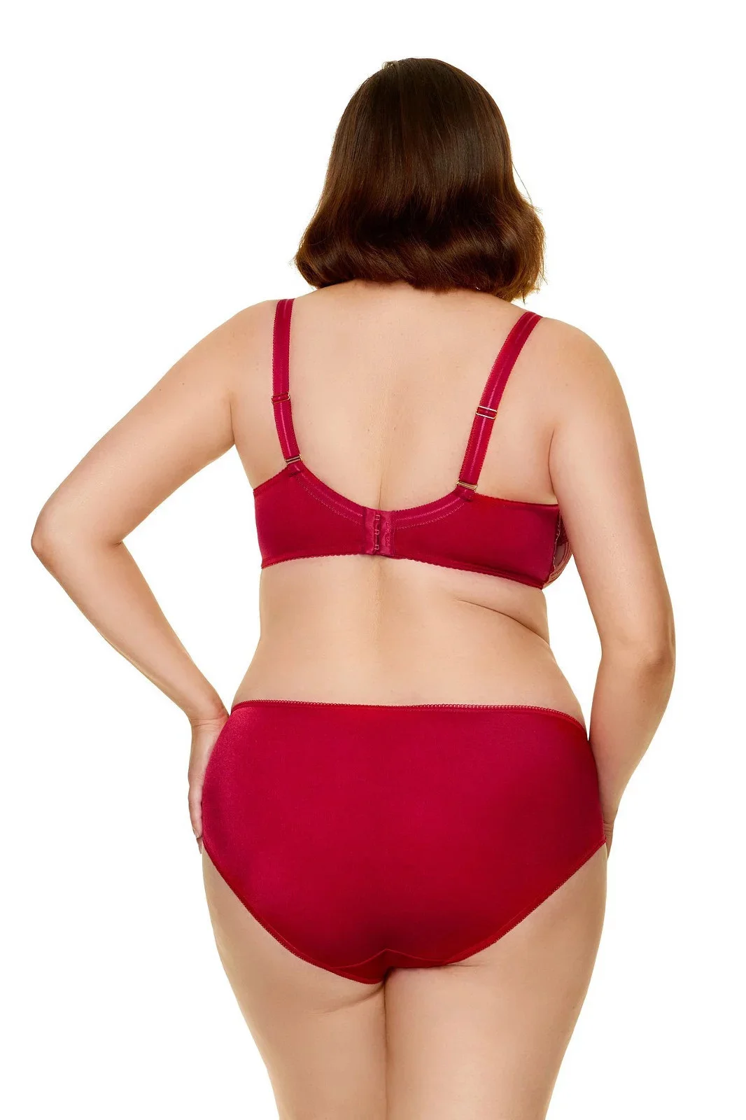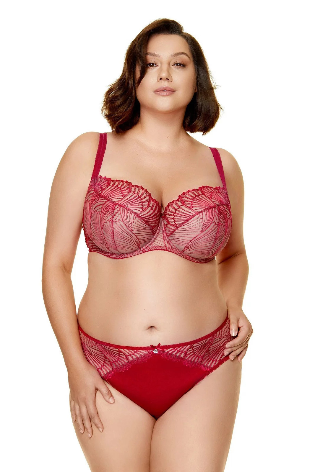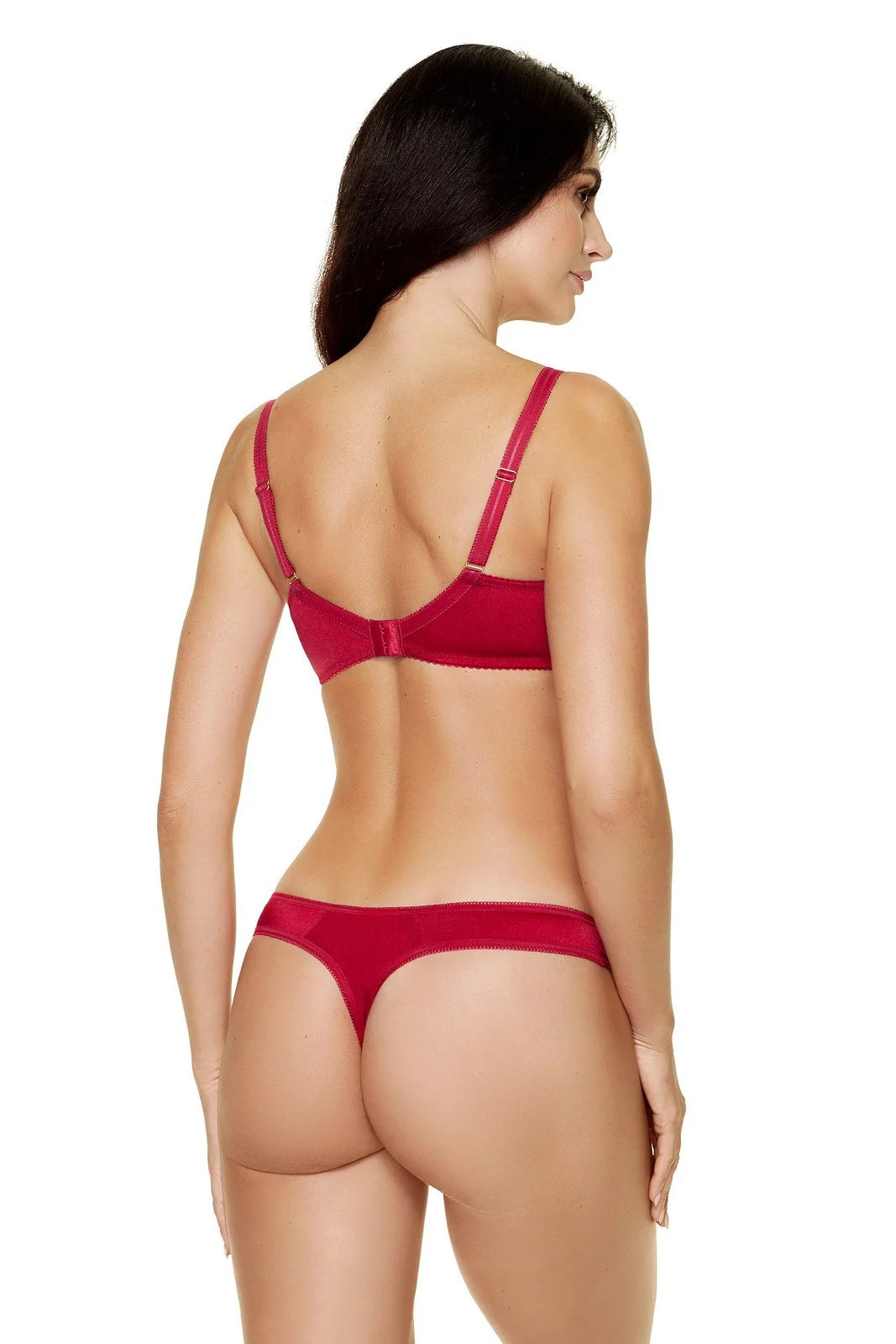 Podprsenka je vyrobená ze síťoviny s efektní výšivkou v hluboké červené barvě. Košíčky se svislým a šikmým švem dokonale nadnáší poprsí a dodávají mu pěkný oblý tvar. Spojení košíčků zdobí saténová páska s přívěskem. Boky modelu jsou zpevněné svislými kosticemi. Ozdobná ramínka je možné nastavit, ale nelze je odepnout.