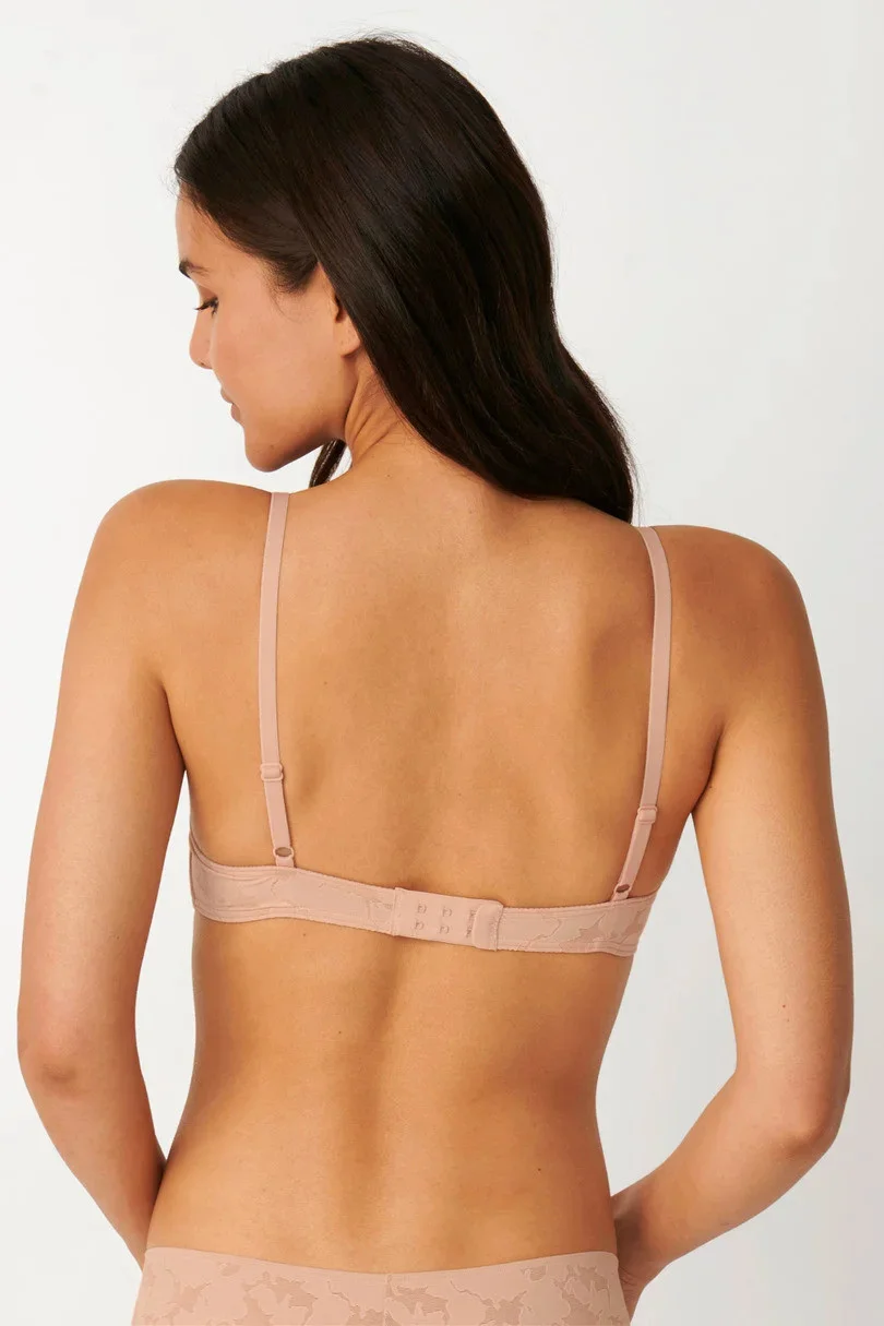 Podprsenku zdobí jemný žakárový vzor. Pěkná plochá krajková tkanina dodává kolekci jemný vzhled. Pružný materiál se ideálně přizpůsobuje tvaru postavy. Délku pohodlných tenkých ramínek je možné nastavit. Podprsenka se nerýsuje ani pod těsným oblečením díky technologii provedení Dot-bonding.