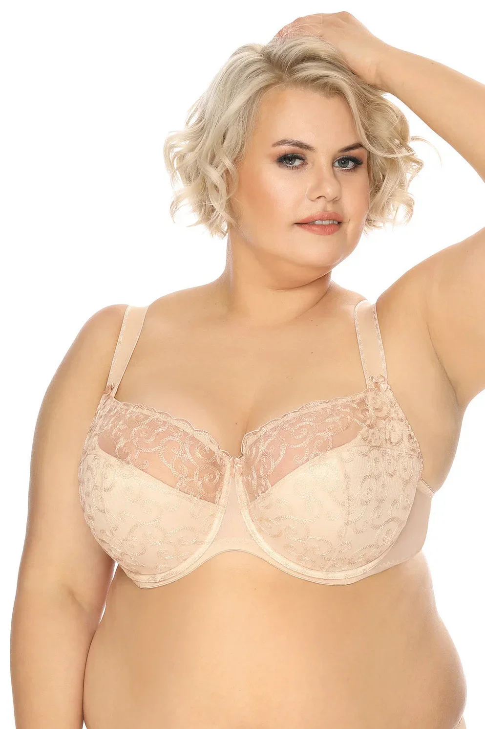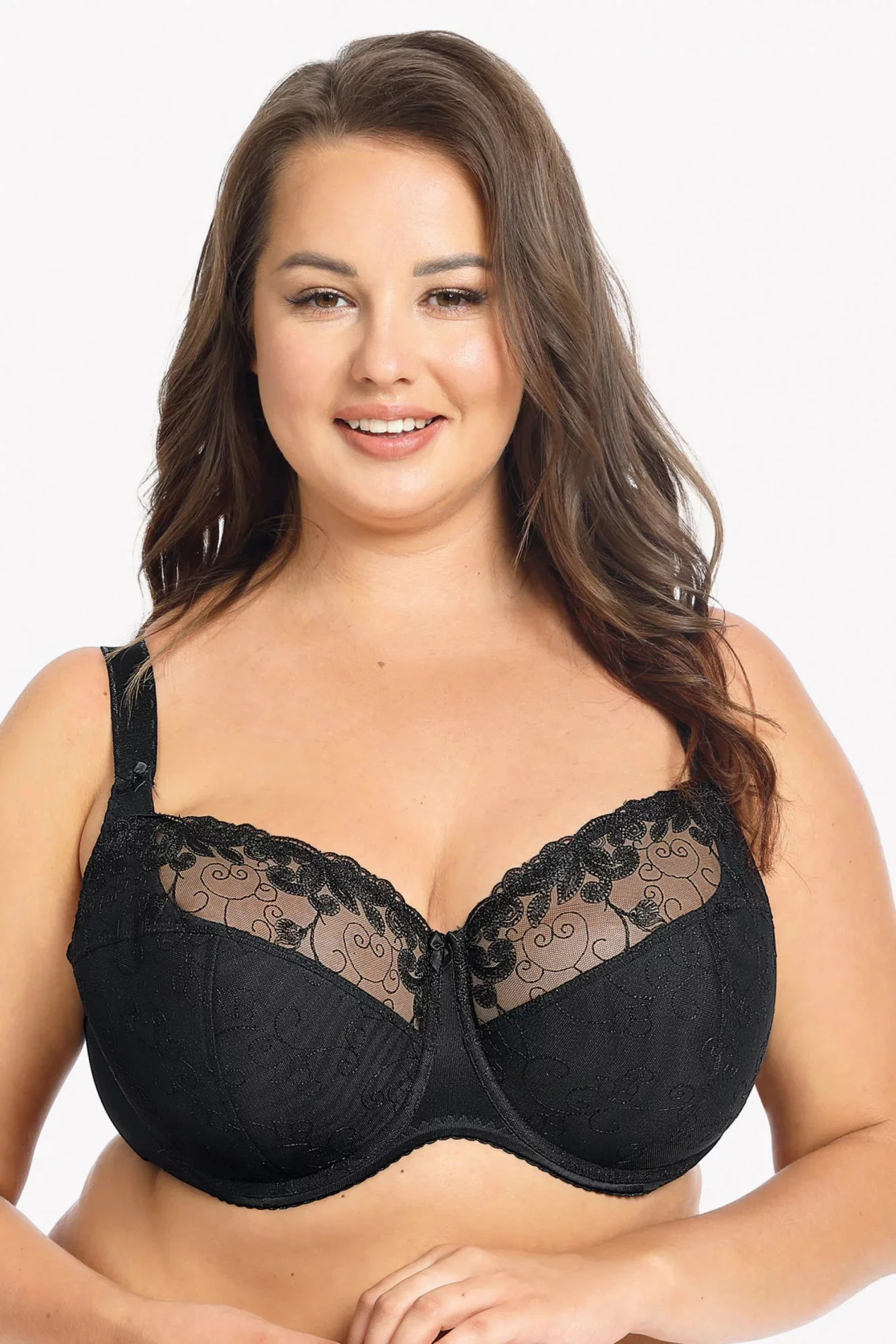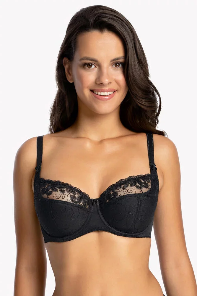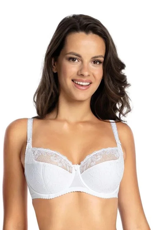 Polovyztužená dámská podprsenka, která je vyrobená z jemné tylové síťoviny ozdobené výšivkou.