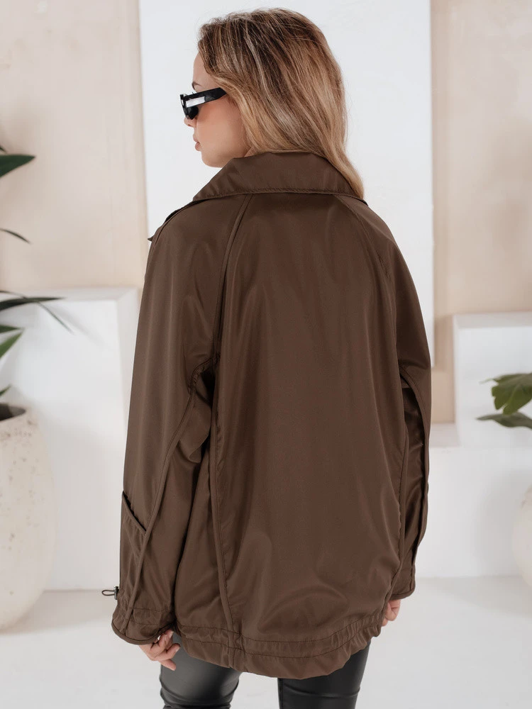 Stylová oversize bunda delšího střihu. Model má ve spodní části žebrované lemy. Bunda se zapíná na zip. Je velmi lehká, díky čemuž je ideální pro teplé dny. Rukávy jsou zakončeny ozdobným žebrováním.