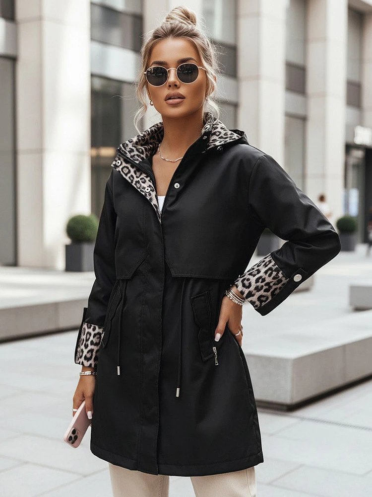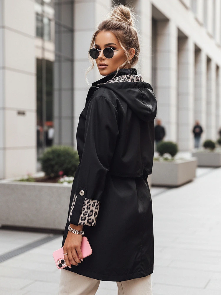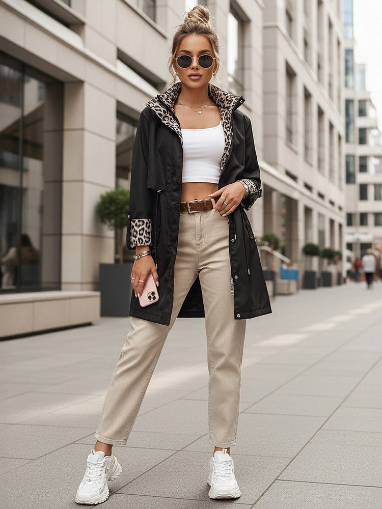 Stylová přechodná bunda s módními detaily inspirovanými zvířecím potiskem. Model se zapíná na patentky a zip, má nastavitelný pas, rukávy a kapuci pro dokonalé přizpůsobení. Má ozdobné kapsy a odnímatelnou kapuci pro větší styl a šarm. Skvěle se hodí pro každodenní a elegantní styling.
