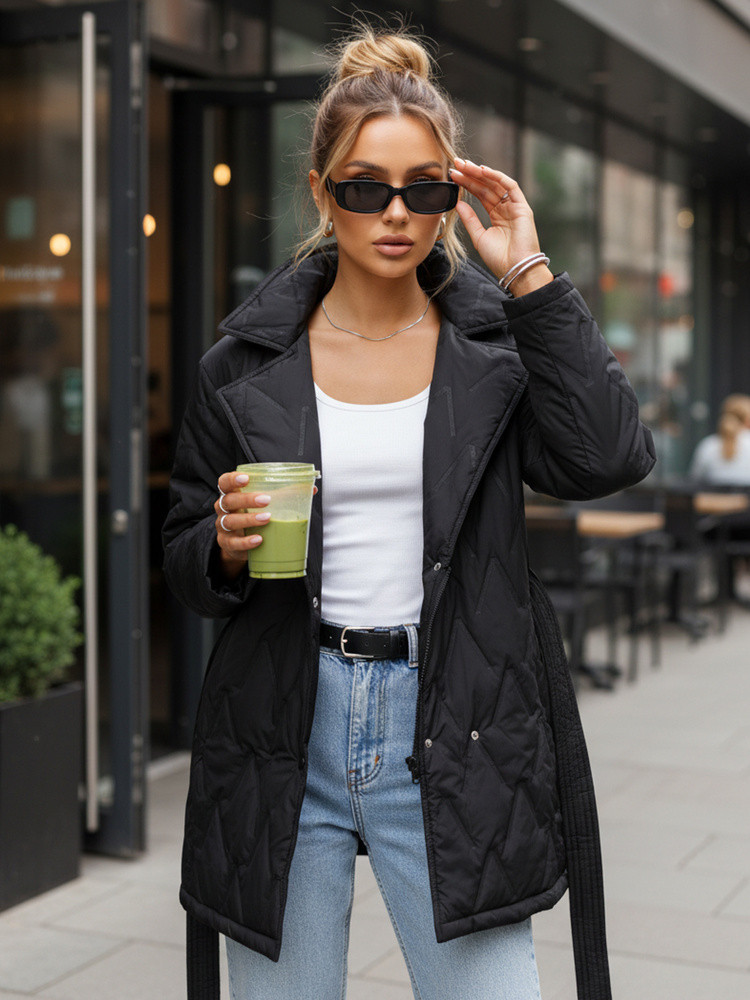Tato prošívaná přechodová bunda s páskem v pase kombinuje funkčnost s ženským střihem. Lehce zateplená konstrukce je ideální pro chladnější jarní a podzimní dny. Zavazovací pásek umožňuje zvýraznit pas a přizpůsobit střih vaší postavě, čímž dodá vašemu stylingu elegantní nádech.