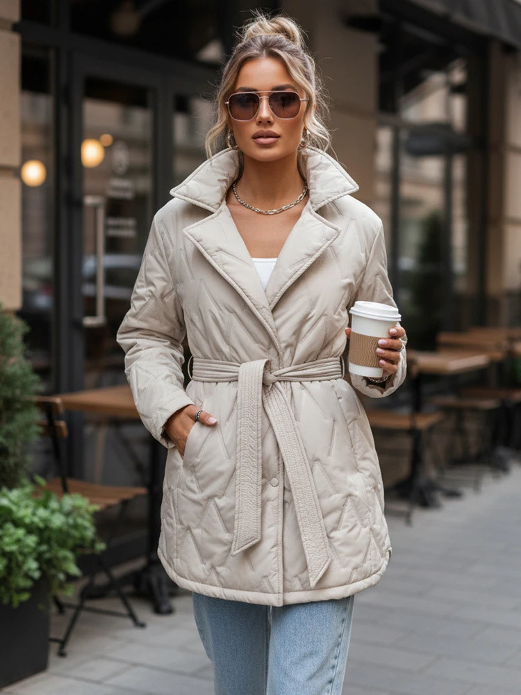 Tato prošívaná přechodová bunda s páskem v pase kombinuje funkčnost s ženským střihem. Lehce zateplená konstrukce bude ideální pro chladnější jarní a podzimní dny. Zavazovací pásek vám umožní zvýraznit pas a přizpůsobit střih vaší siluetě, čímž dodá vašemu stylingu elegantní nádech.