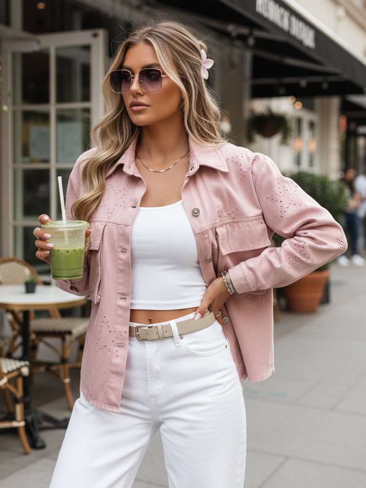 Ležérní dámská bunda ideální pro přechodné období se zapínáním na knoflíky, klasickým límcem a praktickými kapsami. Univerzální velikost je vhodná pro velikosti XS až L. Zdobí ji decentní motiv hvězdiček, který jí dodává jedinečný nádech. Dobře se kombinuje s džínami i elegantními kalhotami a vytváří stylový vzhled.