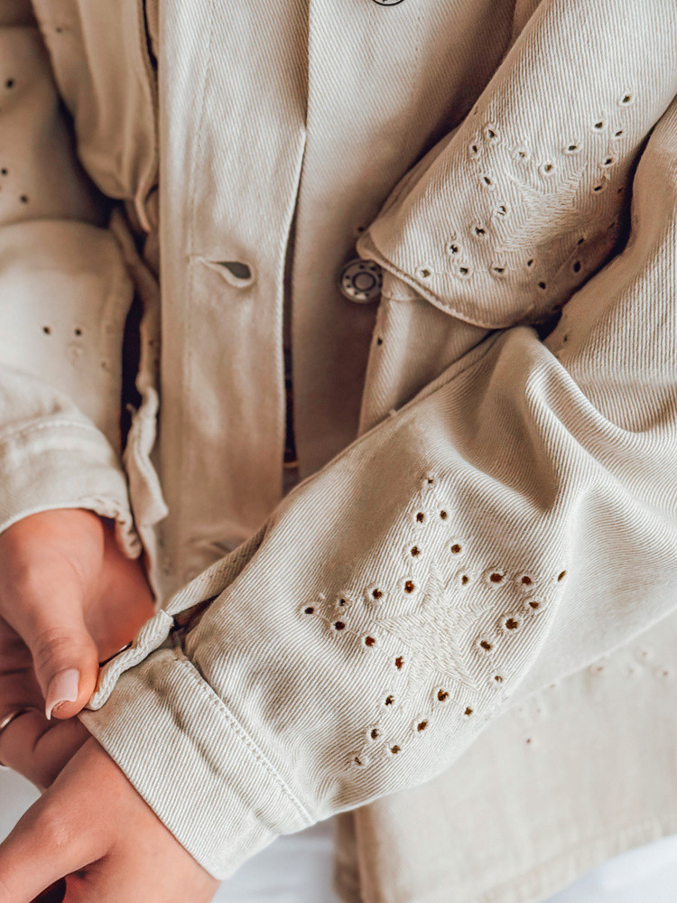 Ležérní dámská bunda ideální pro přechodné období se zapínáním na knoflíky, klasickým límcem a praktickými kapsami. Univerzální velikost je vhodná pro velikosti XS až L. Zdobí ji decentní motiv hvězdiček, který jí dodává jedinečný nádech. Dobře se kombinuje s džínami i elegantními kalhotami a vytváří stylový vzhled.