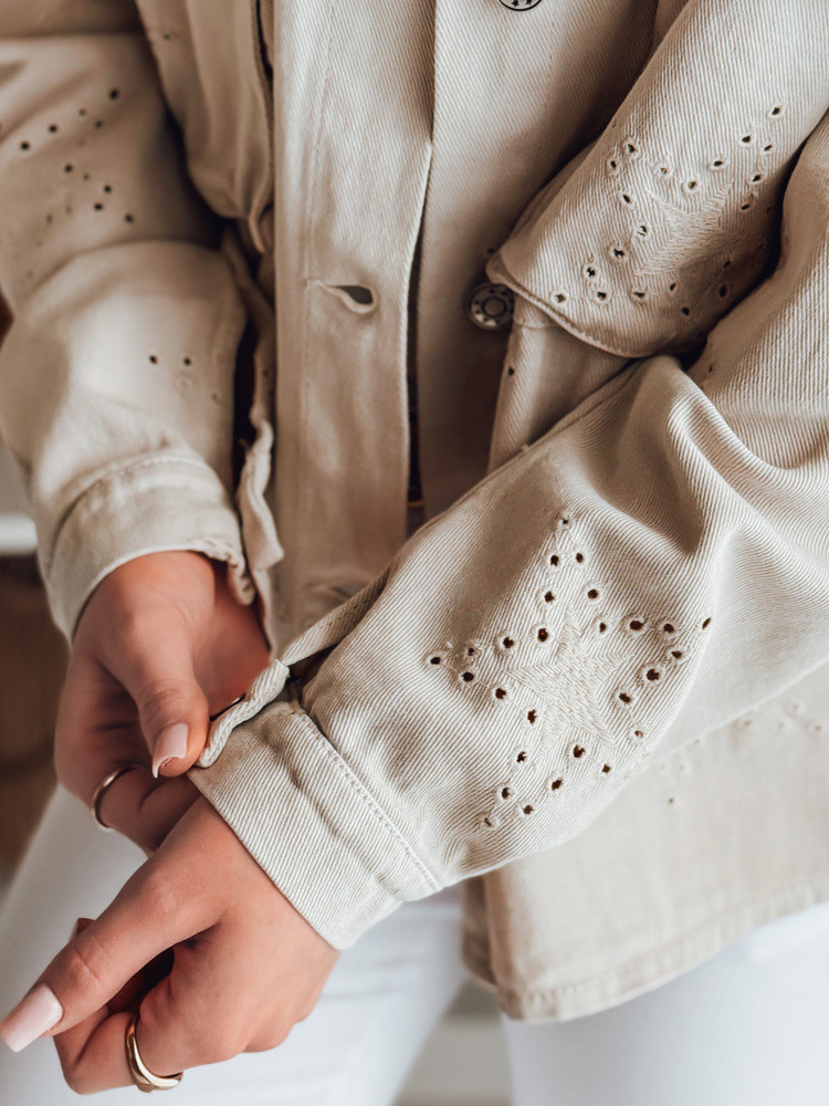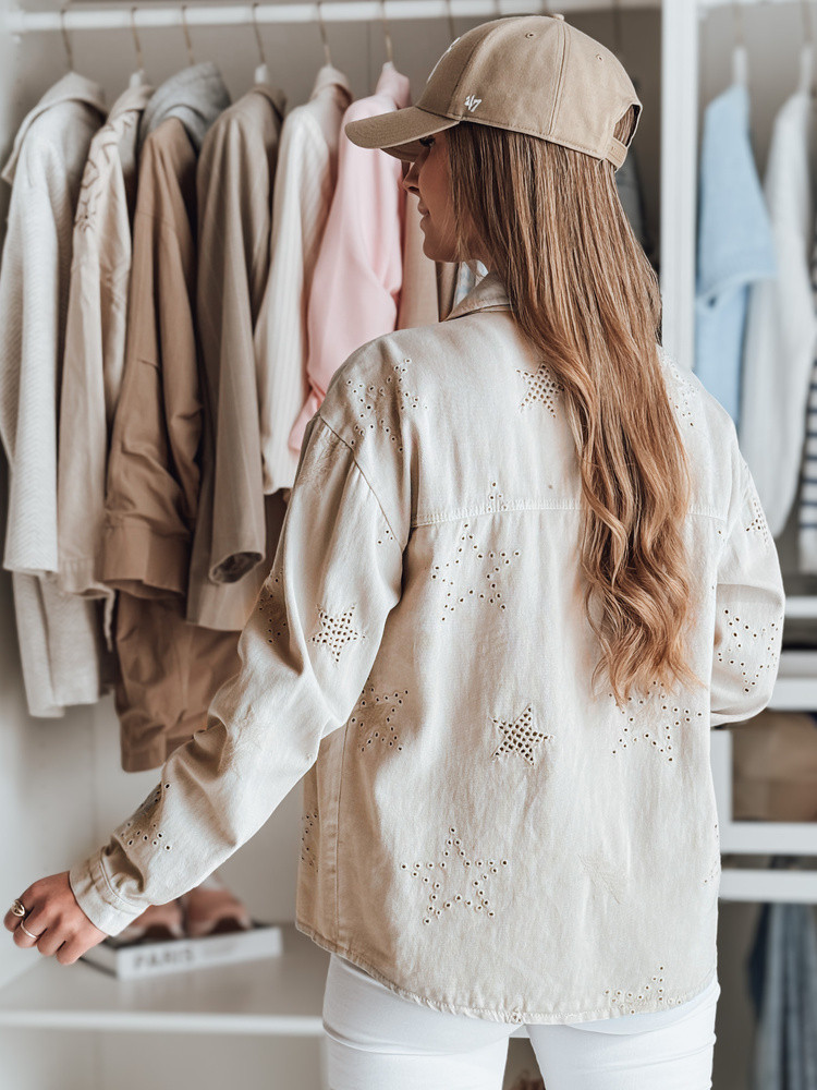 Kurtka damska o casualowym kroju, idealna na sezon przejściowy. Zapinana na guziki, z klasycznym kołnierzem i praktycznymi kieszeniami. Uniwersalny rozmiar pasuje od XS do L. Ozdobiona subtelnym motywem gwiazdek, które dodają jej unikalnego charakteru. Świetnie komponuje się zarówno z jeansami, jak i eleganckimi spodniami, tworząc stylowy look.