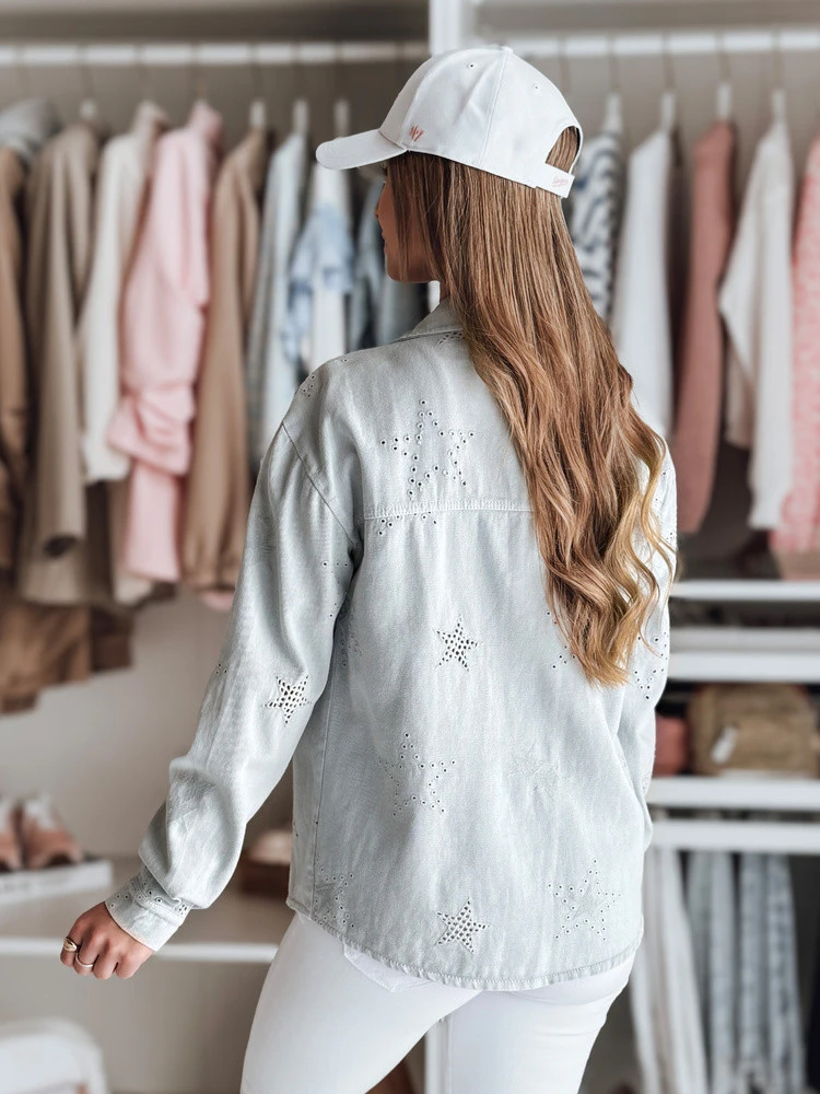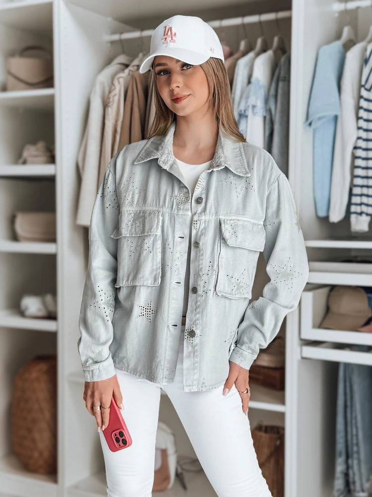 Kurtka damska o casualowym kroju, idealna na sezon przejściowy. Zapinana na guziki, z klasycznym kołnierzem i praktycznymi kieszeniami. Uniwersalny rozmiar pasuje od XS do L. Ozdobiona subtelnym motywem gwiazdek, które dodają jej unikalnego charakteru. Świetnie komponuje się zarówno z jeansami, jak i eleganckimi spodniami, tworząc stylowy look.