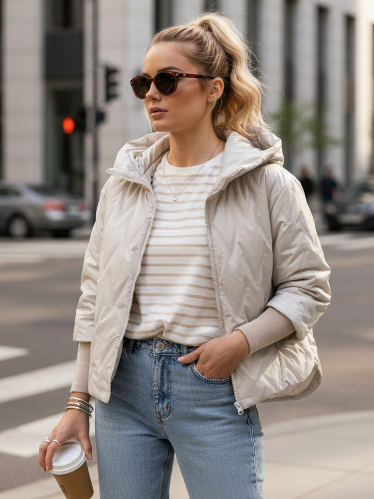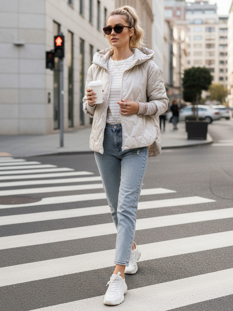 Bunda se hodí k městskému stylu s džínami, legínami a látkovými kalhotami, stejně jako ke sportovním kompletům s teniskami. Dvě boční kapsy usnadňují uložení drobných předmětů na cestě do práce, na univerzitu nebo během procházky.