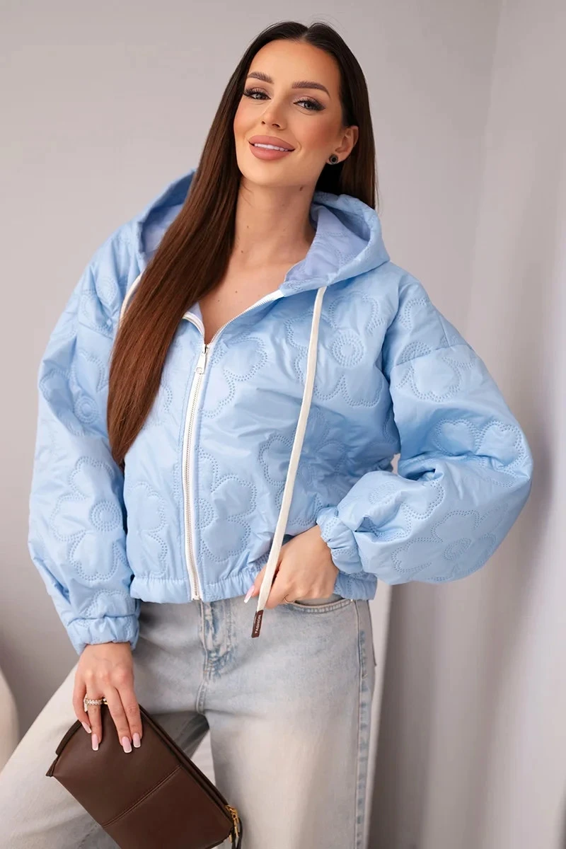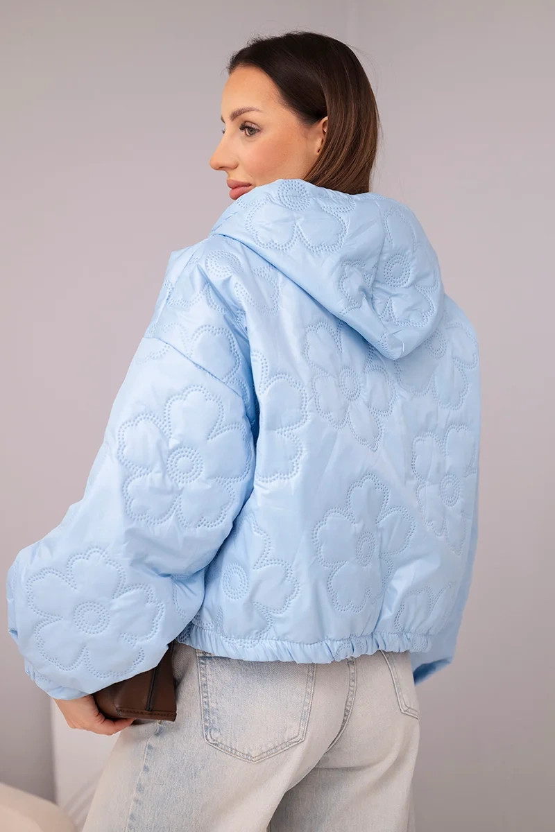 • Dámská prošívaná bunda s kapucí a ozdobným květinovým model 21998366 modrá - K-Fashion