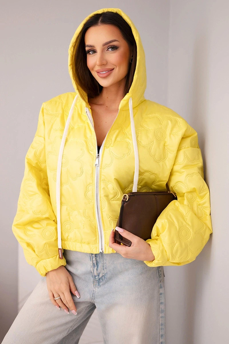 • Dámská prošívaná bunda s kapucí a ozdobným květinovým ražením žlutá