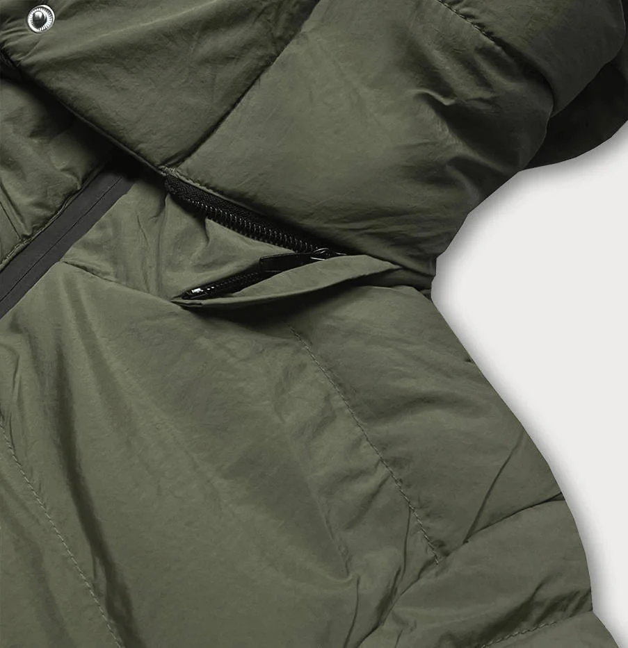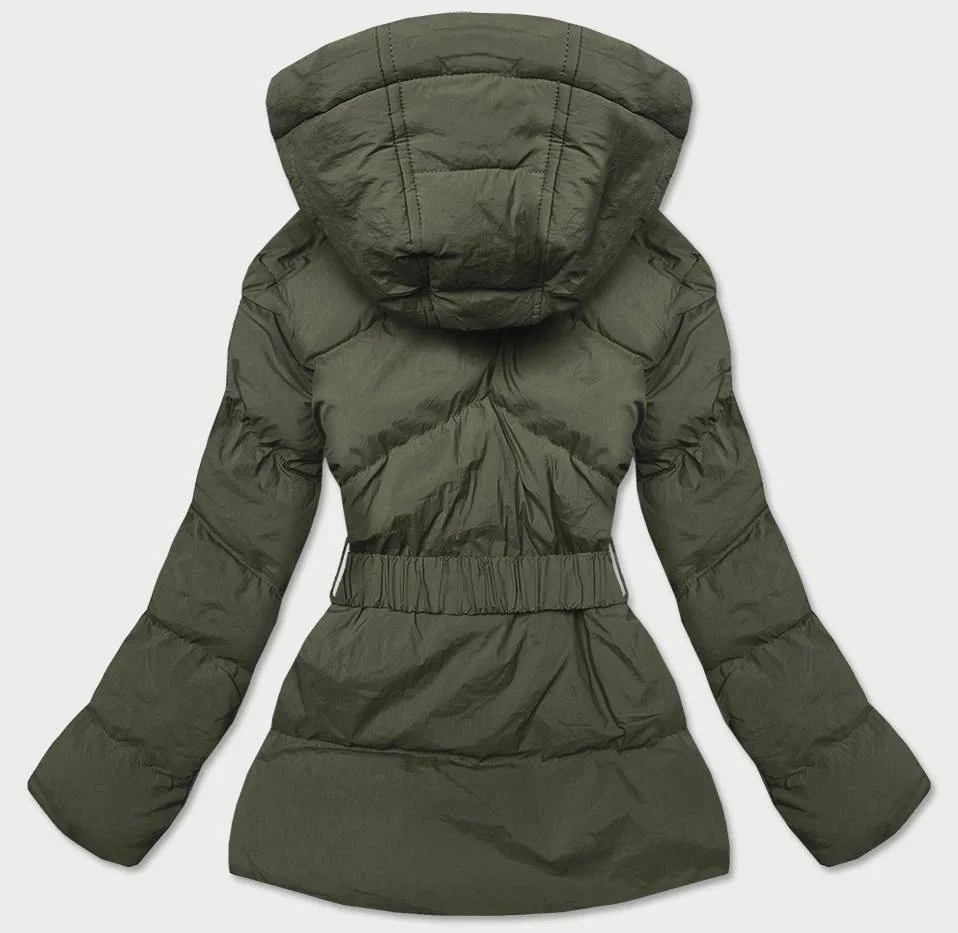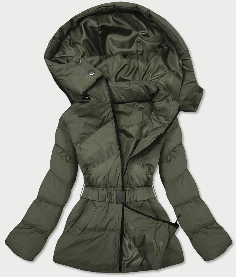 Dámská prošívaná bunda v khaki barvě s opaskem pro přechodné období (23060-2)