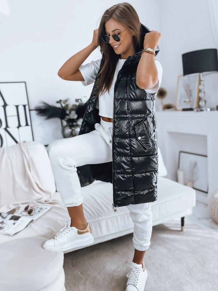 Fenomenální prošívaná vesta, vyrobená z kluzkého, lesklého materiálu. Model má v pase stahovací šňůrku, díky které krásně zvýrazní ženskou siluetu. Vesta se zapíná na zip a má neodnímatelnou kapuci. Ideální pro ty, kteří ocení styl a pohodlí.