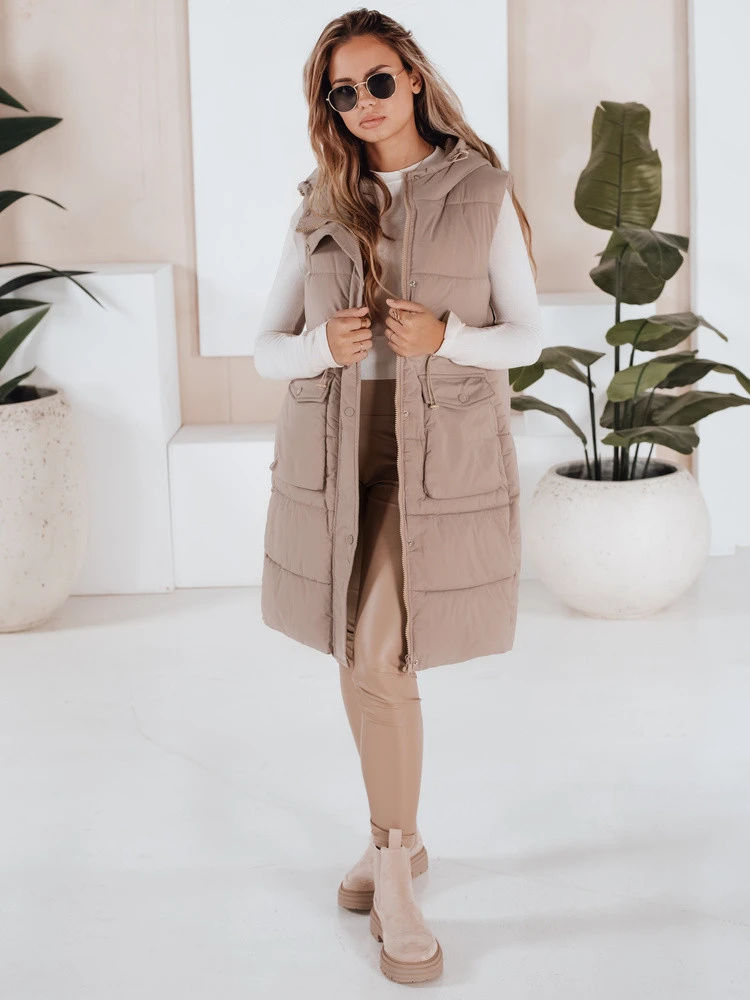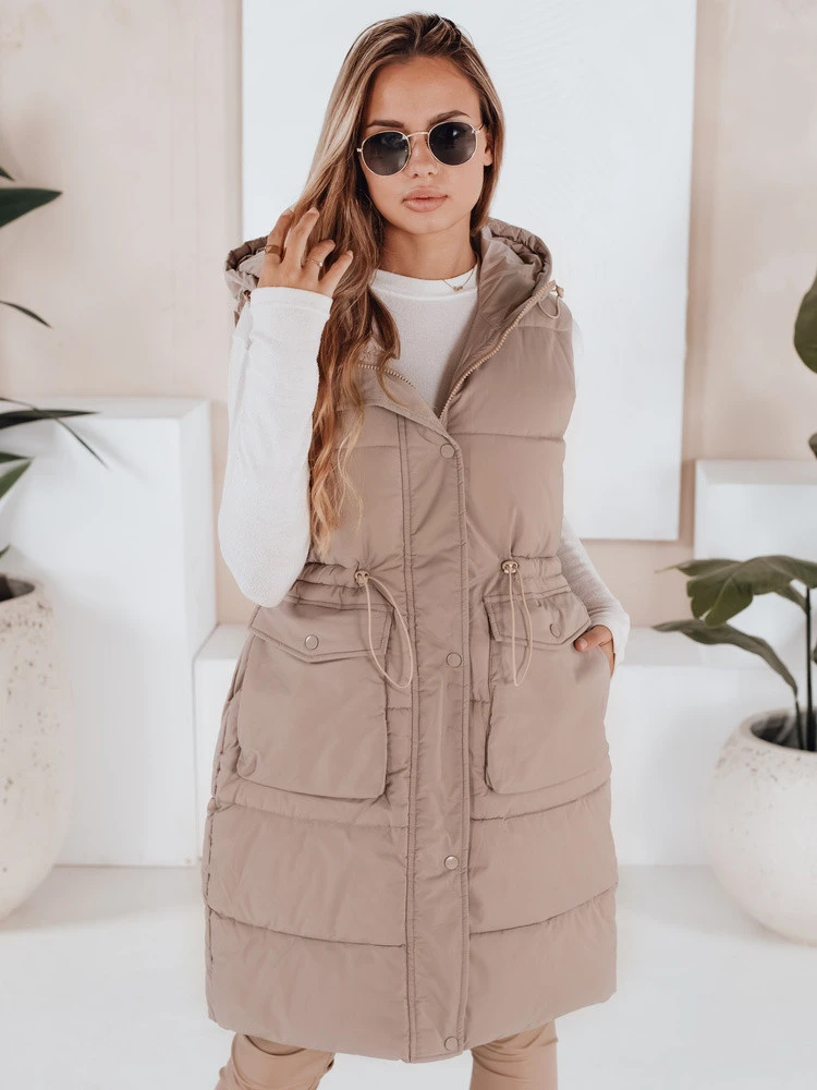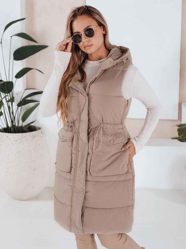 Prošívaná vesta LADISA dlouhého střihu má velkou neodnímatelnou kapuci, stahovací šňůrku v pase, která krásně zvýrazní váš pas, a dvě praktické kapsy, které zároveň slouží jako ozdobný prvek. Krásně doplní jakýkoli váš outfit a je k dispozici ve třech barevných provedeních.