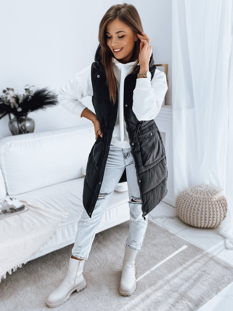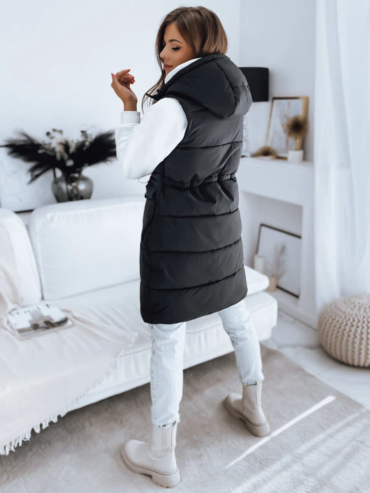 Prošívaná vesta LADISA dlouhého střihu má velkou neodnímatelnou kapuci, stahovací šňůrku v pase, která krásně zvýrazní váš pas, a dvě praktické kapsy, které jsou zároveň ozdobným prvkem. Krásně doplní jakýkoli váš outfit a je k dispozici ve třech barevných provedeních.