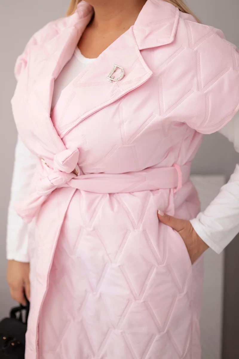 Dámská prošívaná vesta Plus Size s páskem a límcem bonbónově růžová