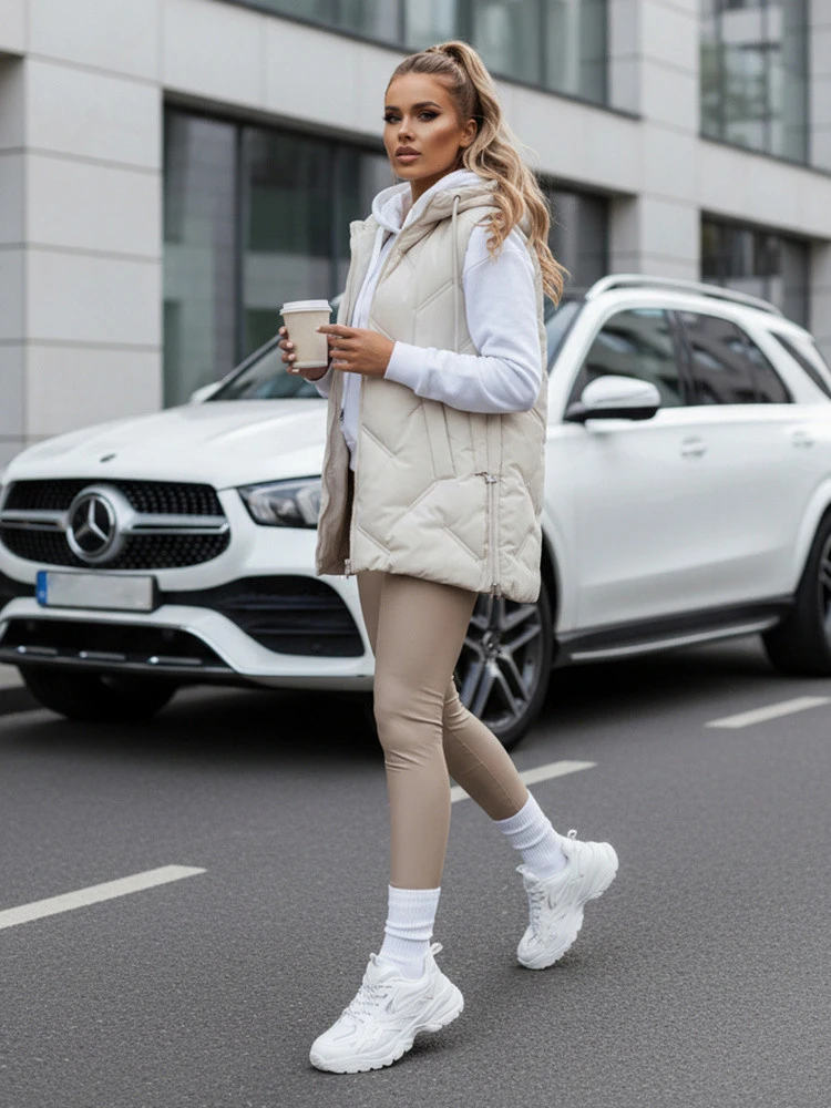 tato lehká prošívaná vesta s kapucí je skvělou alternativou k bundě. Její moderní střih se stahovacími šňůrkami na bocích umožňuje přizpůsobit délku vaší postavě a díky funkčním detailům je ideální pro každodenní nošení.