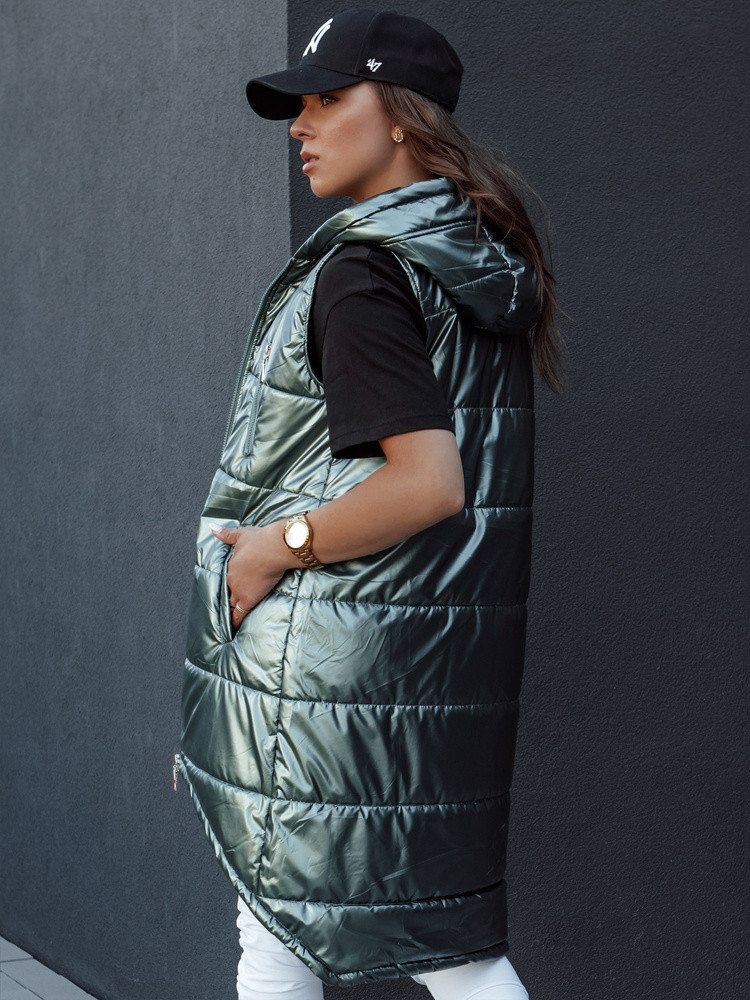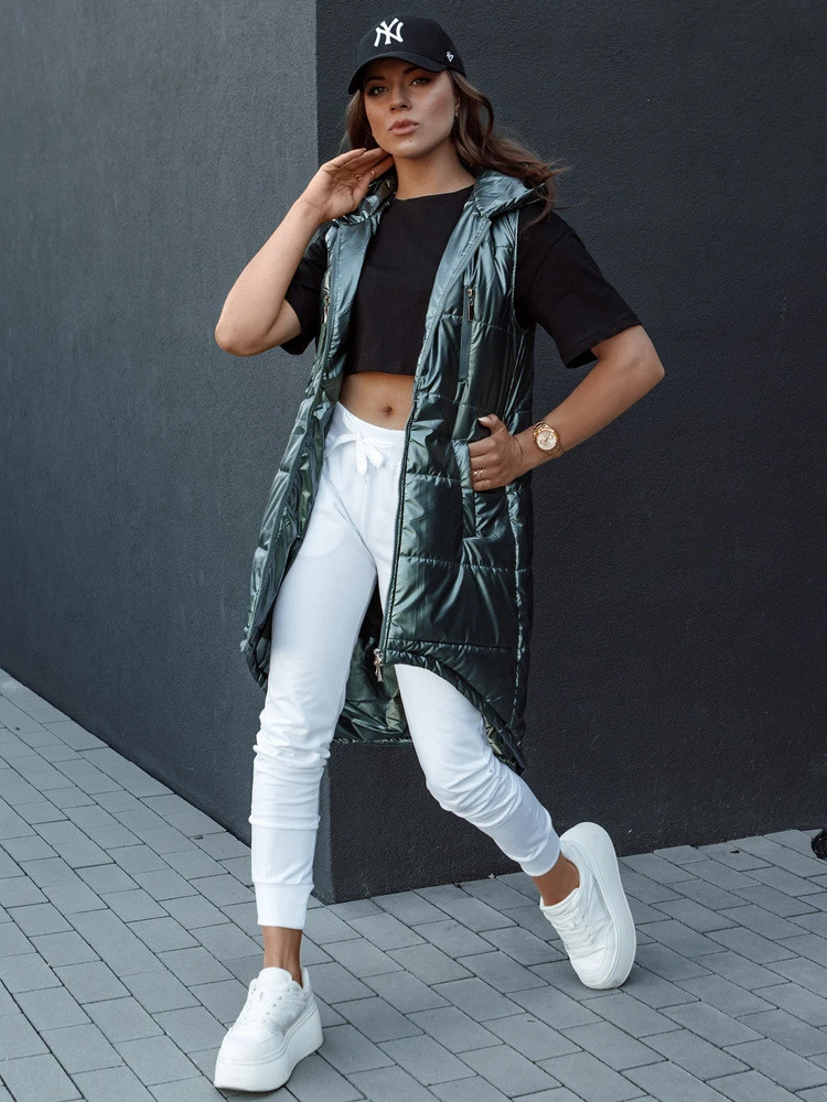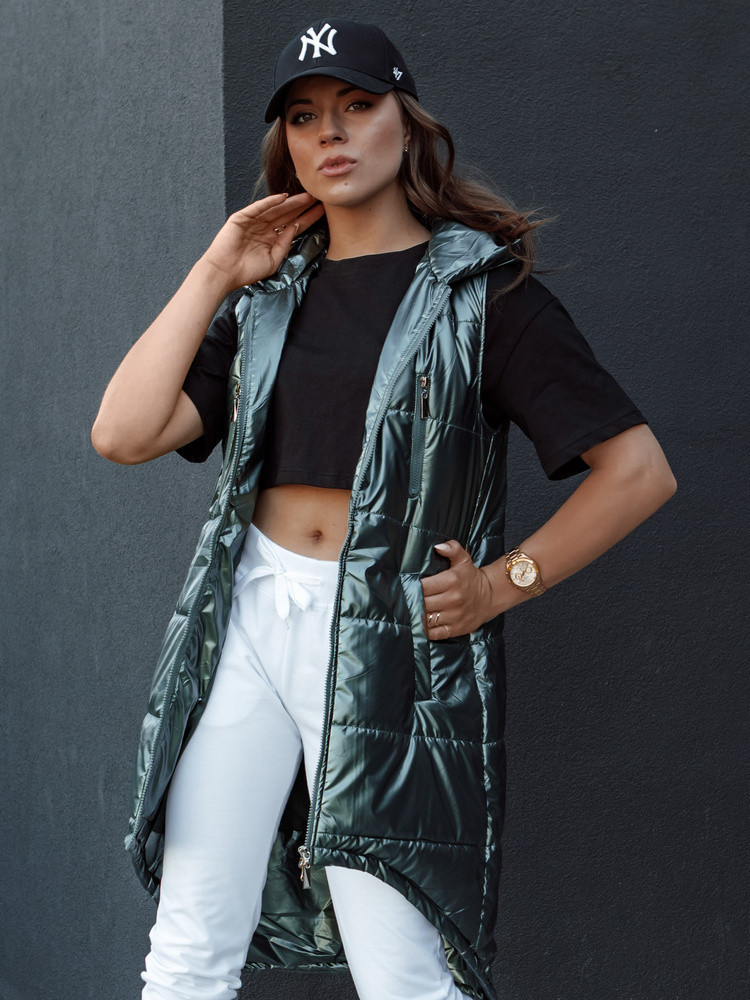 Dámská prošívaná vesta s kapucí dlouhá MERIS tmavě zelená FashionStreet TY4425