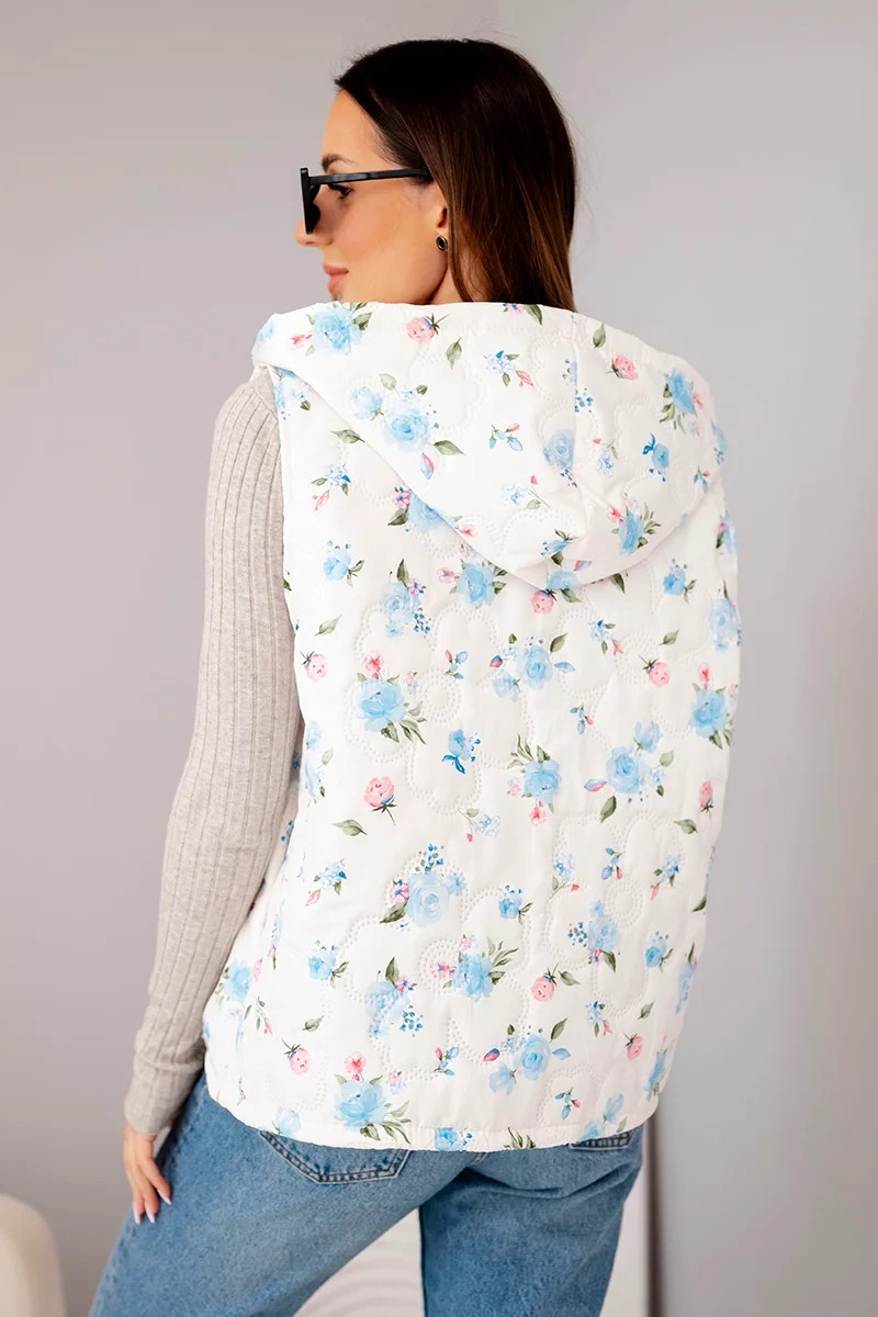 Dámská prošívaná vesta s kapucí s květinovým vzorem modrá
