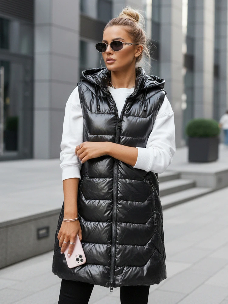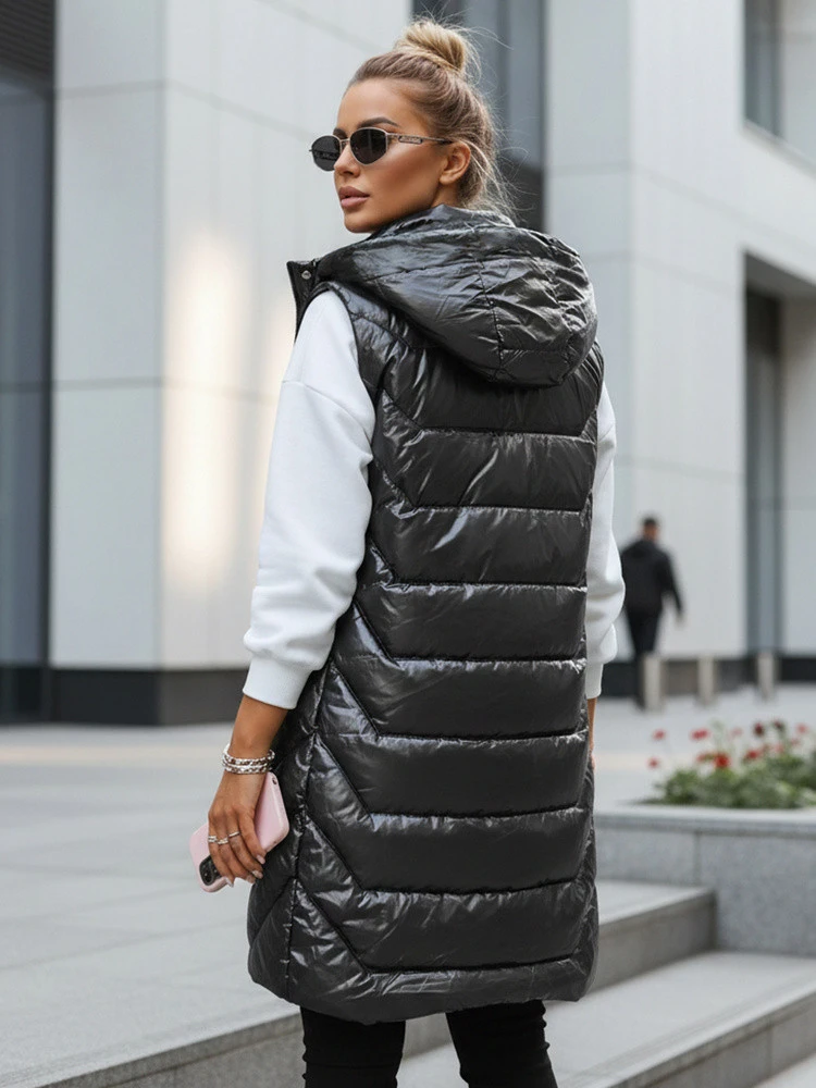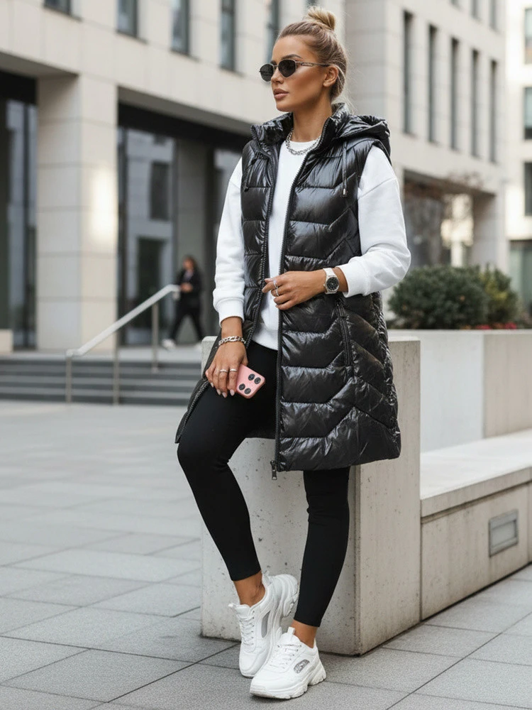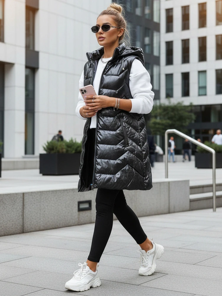 Tato všestranná vesta v délce do poloviny stehen kombinuje funkčnost s moderním stylem. Díky prošívané struktuře a odnímatelné kapuci je vhodná do různých povětrnostních podmínek, model je ideální pro městský a ležérní styling.