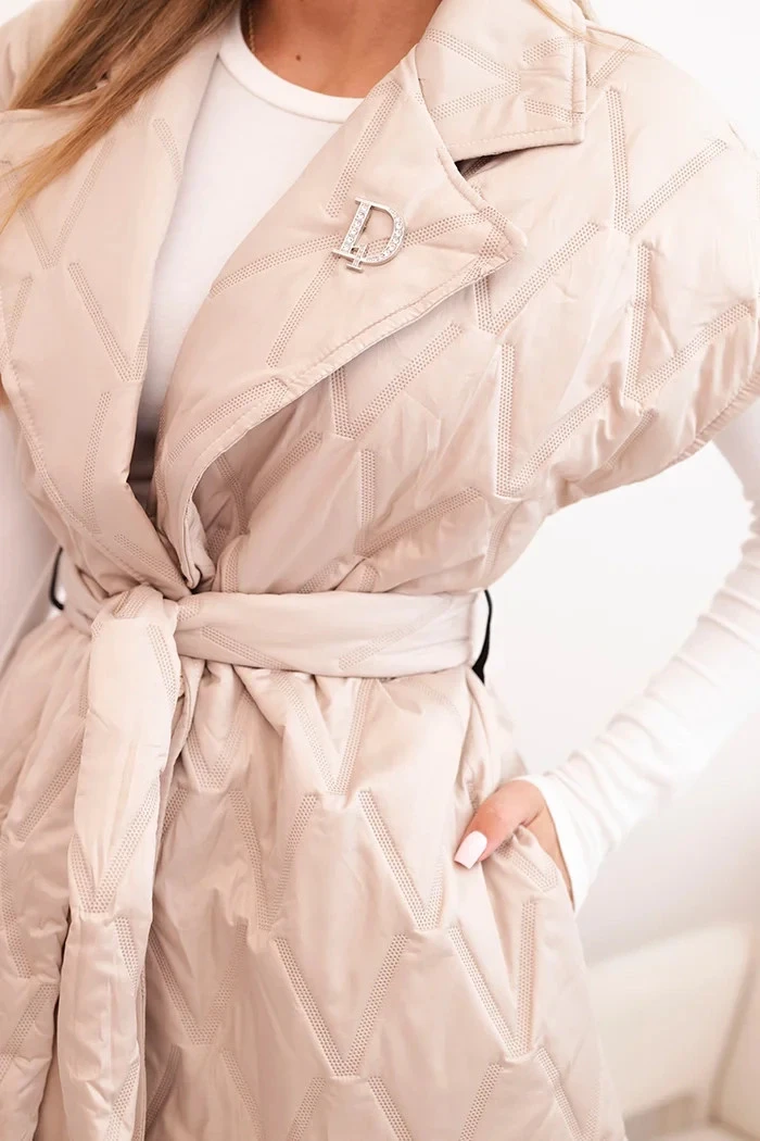 • Dámská prošívaná vesta s páskem a širokým límcem béžová