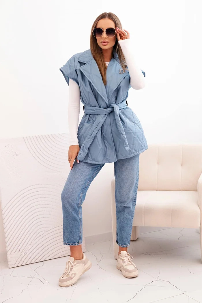 Dámská prošívaná vesta s páskem a širokým límcem džínová