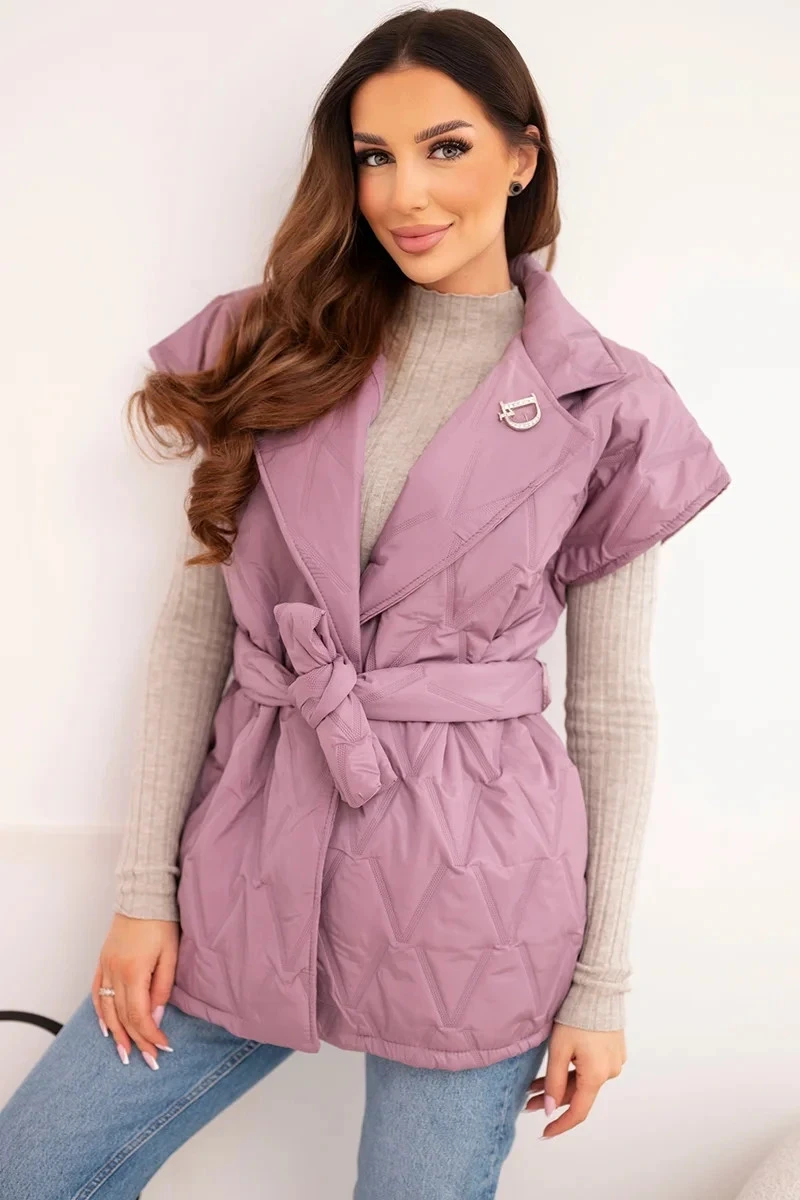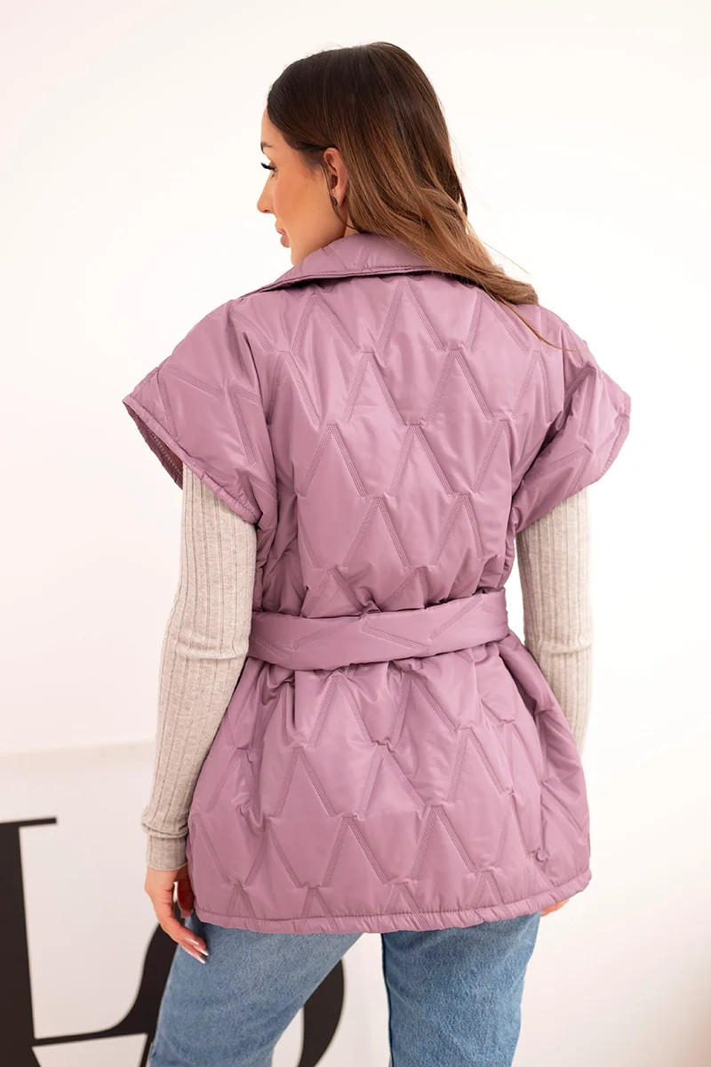 • Dámská prošívaná vesta s páskem a širokým límcem tmavě růžová