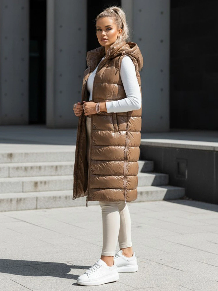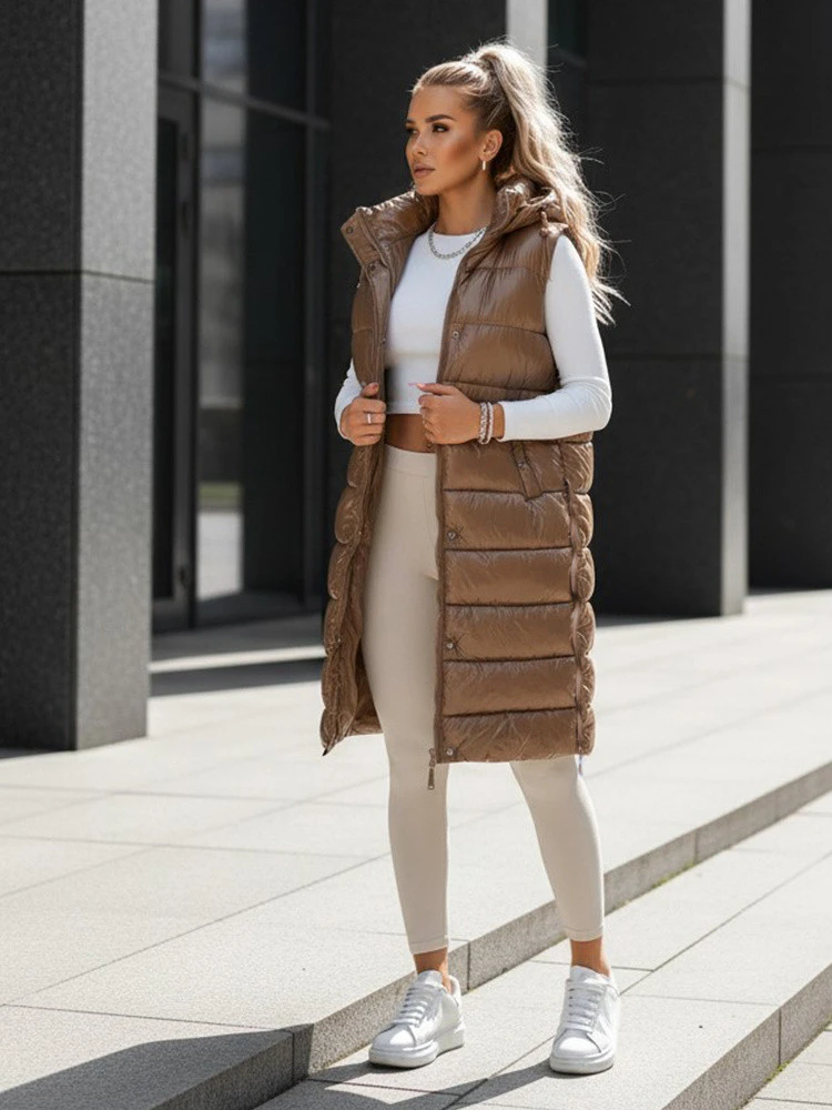 Tato prošívaná vesta s prodlouženým střihem doplňuje stylizaci do chladného počasí a poskytuje další vrstvu pohodlí, aniž by omezovala volnost pohybu. Lesklá tkanina dodává moderní nádech, zatímco svislé prošívání upravuje siluetu. Kapuce zvyšuje funkčnost v proměnlivém počasí. Model se hodí jak pro sportovní, tak pro ležérní stylizaci.