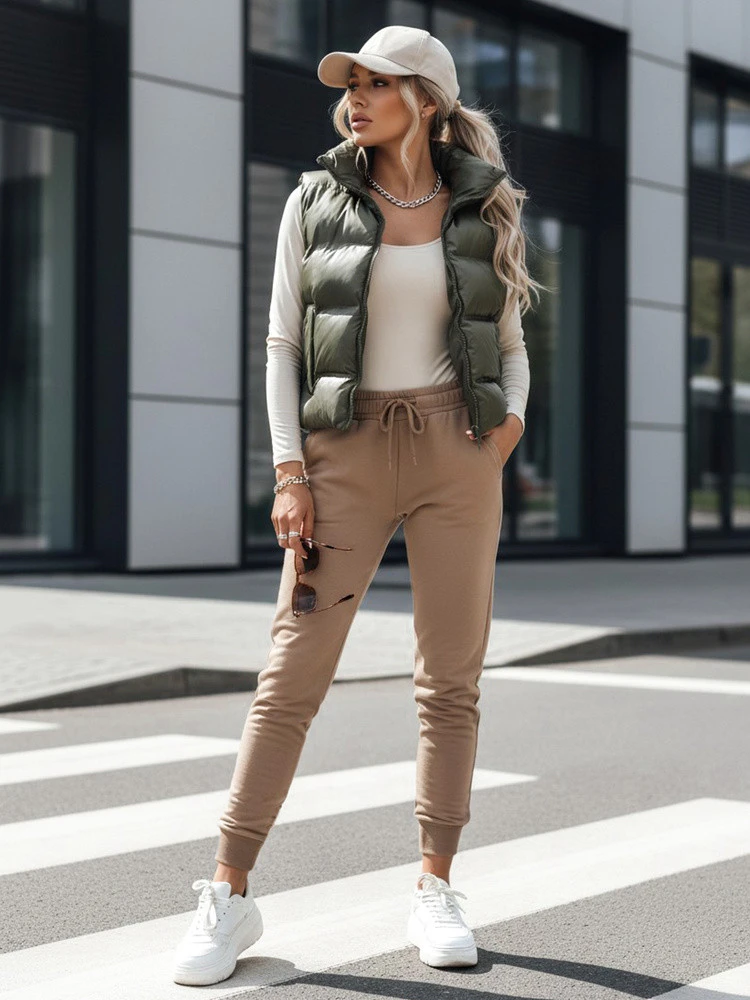 Kratší délka a prošívaný tvar se dobře hodí k běžeckým kalhotám, legínám a sportovní obuvi.