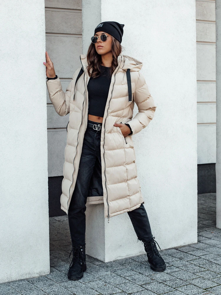 Prošívaná bunda delšího střihu je ideální pro ženy, které si cení stylu a pohodlí. Má neodnímatelnou kapuci, dvě kapsy na zip a střih, který opticky zeštíhluje siluetu. Mimořádně krásná, teplá a pohodlná na nošení.