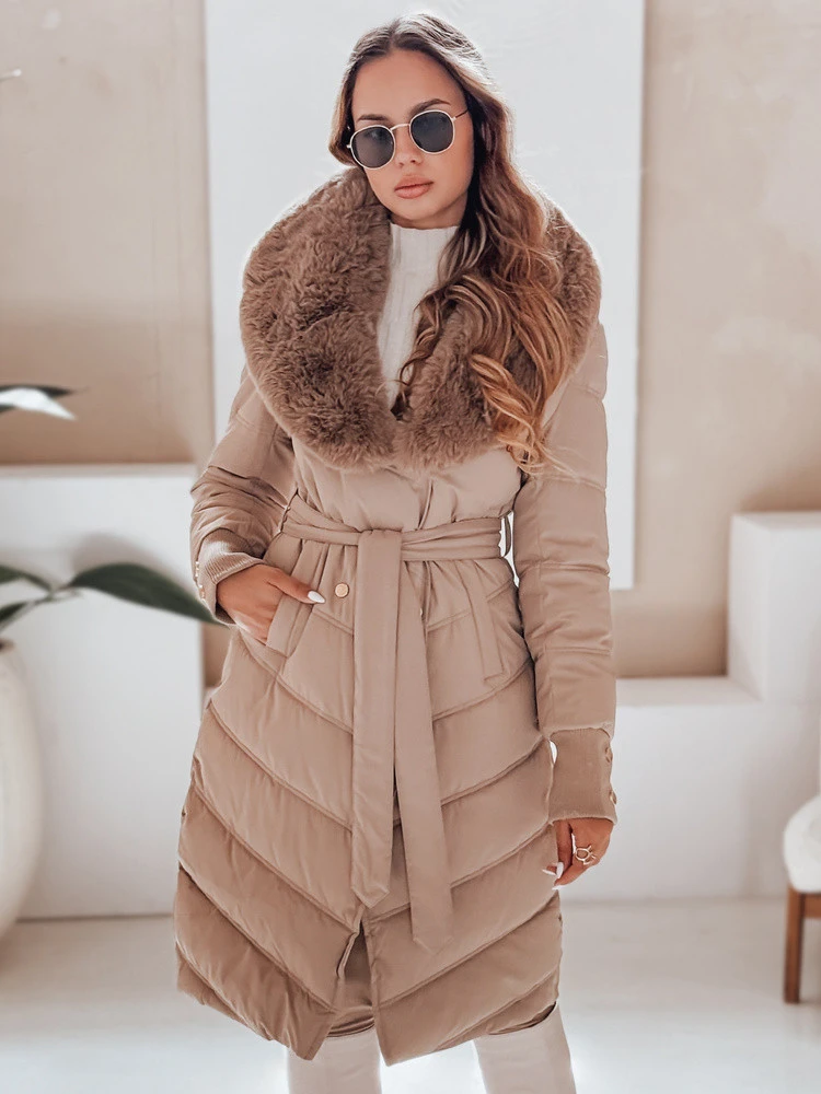 Elegantní a hřejivá zimní bunda s výrazným límcem zakončeným odnímatelnou kožešinou. Model na zip se zavazováním v pase a zateplenými rukávy. Prošívaný materiál a rafinovaný střih vytvářejí praktický a ženský oděv pro chladné dny.