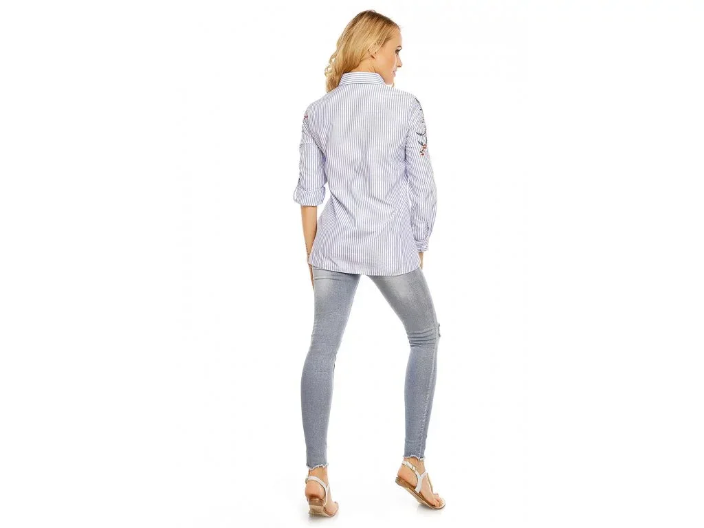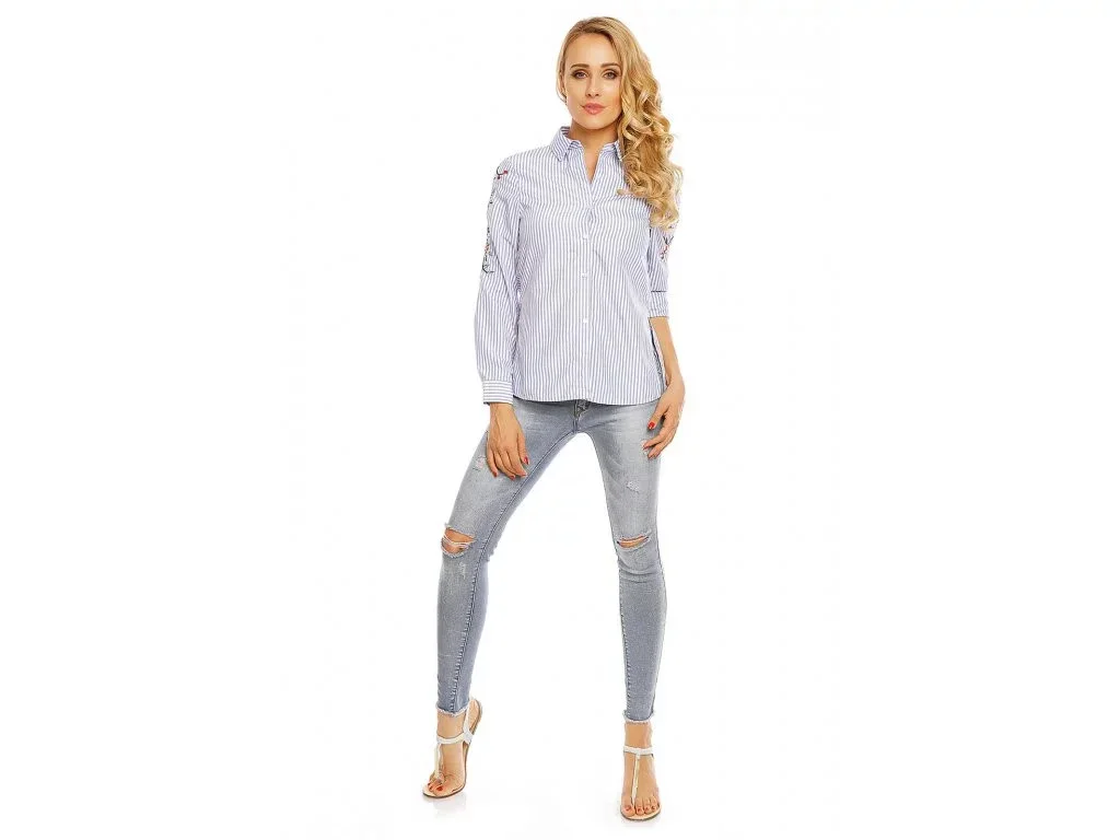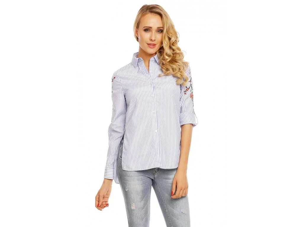 Dámská košile s dlouhým rukávem a prošívanými květinami na rukávech - v modrobílá provedení.