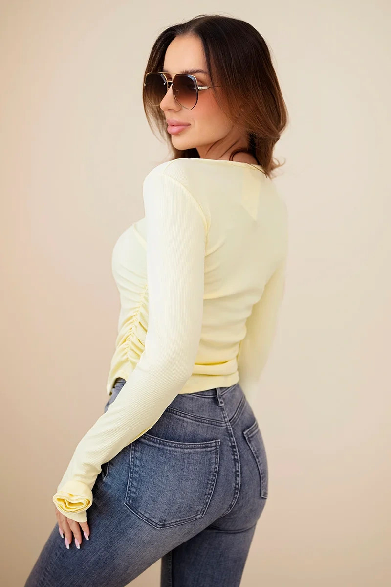 Žebrovaná struktura dodává topu eleganci, a jemné nařasení na boku krásně podtrhuje pas, dodává postavě ženský tvar. Model ideální jak na každodenní nošení, tak na více neformální vycházky – skvěle se kombinuje jak s kalhotami, tak s sukní.