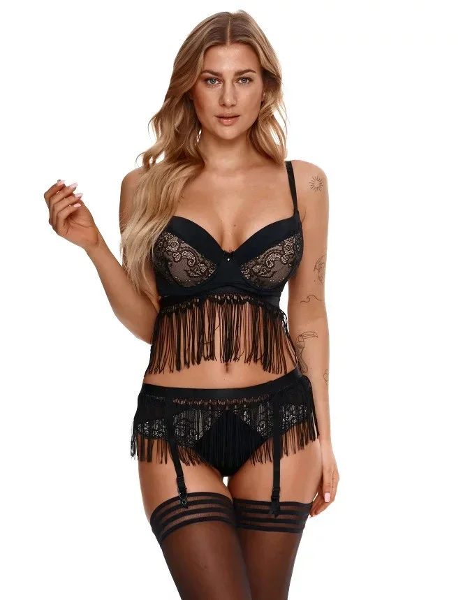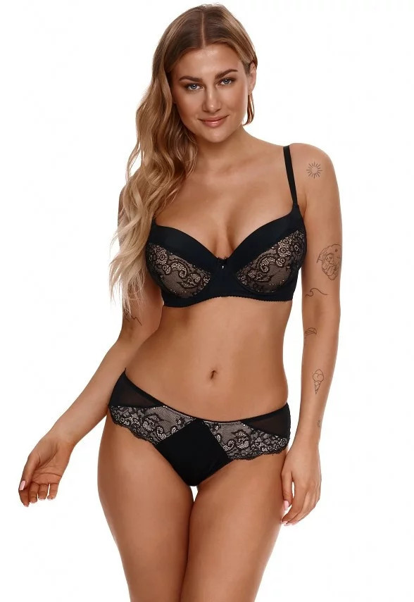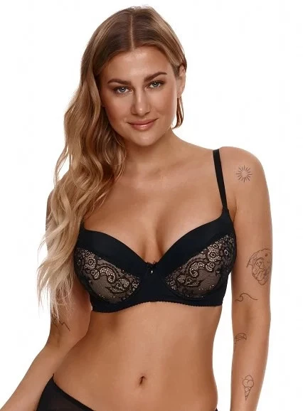 Košíčky v tělové barvě jsou pokryté krajkou a černým mikrovláknem a mají vytvarované gelové vycpávky. Ramínka je možné nastavit, ale nelze je odepnout. V místě spojení košíčků je mašlička s lesklou ozdobou. Ve spodní části modelu je páska s třásněmi, kterou je možné odepnout.