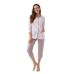 Zachovejte si pohodlí a eleganci i během spánku s tímto dámským pyžamem 388 J/25 ze 100% kvalitní bavlny. Košile s květinovým potiskem na knoflíky zaujme decentním stylem a pohodlím. 3/4 rukávy a praktické boční kapsy činí pyžamo funkčním a ideálním i pro domácí relaxaci. Komplet doplňují hladké kalhoty v rybářském stylu s elastickým pasem pro volnost pohybu a pohodlí.