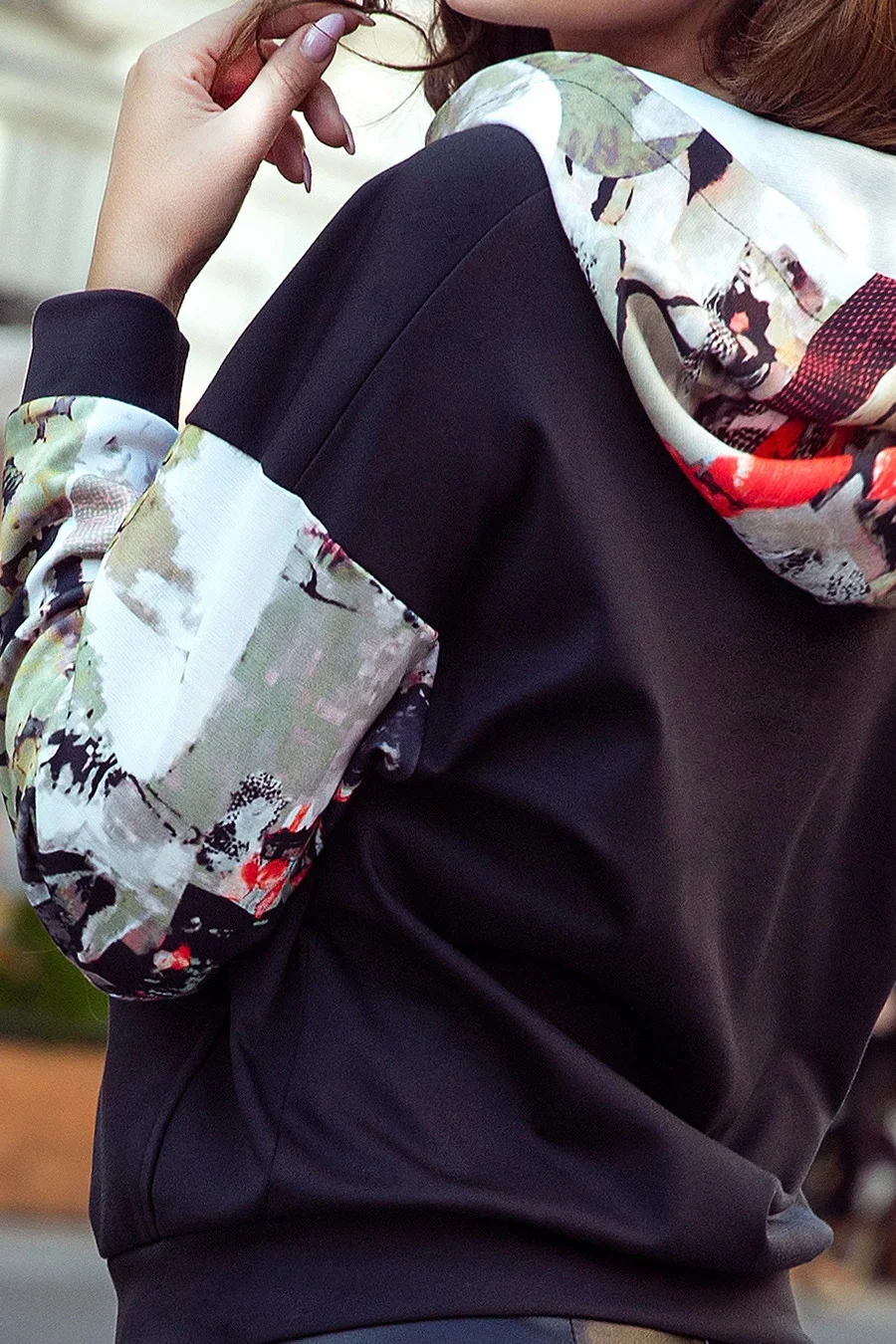 Pohodlná dámská blůza/mikina s klokaní kapsou a kapucí v černé barvě s barevnými vsadkami.