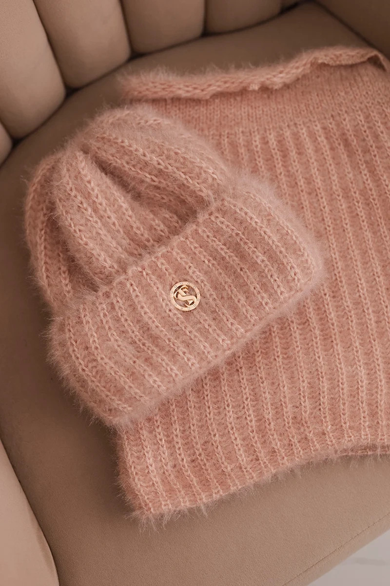 Přidání recenze k Dámská sada čepice a šály zimní huňaté s ozdobným emblémem světle pudrově růžová