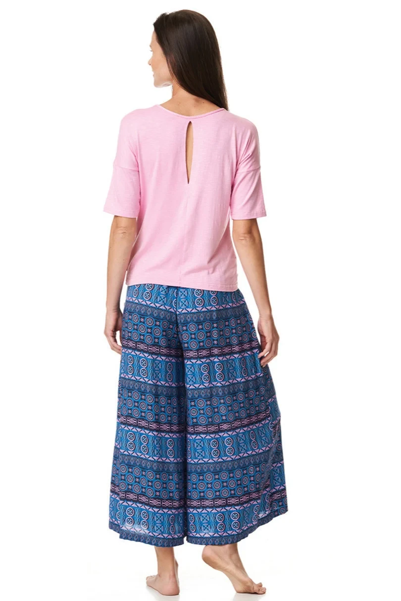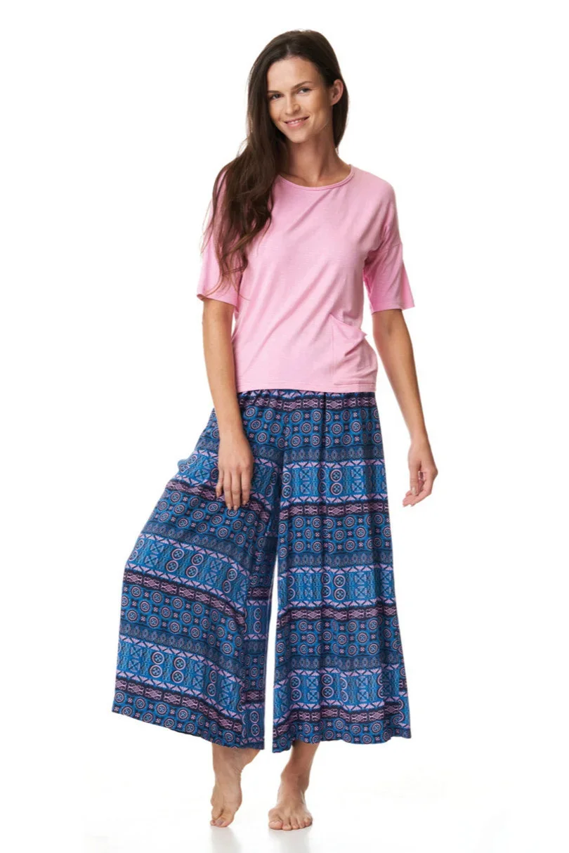Souprava trička se spódnicnicospodni z měkkého viskózového úpletu. Tričko volného, šviháckého střihu s rukávy po lokty a výstřihem na loket ve světlé rós barvě. Kalhoty Culotte, velmi pohodlné a měkké, ideální na jaro a léto. Geometrický vzorór inspirovaný podhalskými motivy v modrých a rór barvách. Souprava trička se spódnicnico;kalhotami z měkkého viskózového úpletu. Tričko volného, šviháckého střihu s rukávy po lokty a výstřihem na loket ve světlé rós barvě. Kalhoty Culotte, velmi pohodlné a měkké, ideální na jaro a léto. Geometrický vzorór inspirovaný podhalskými motivy v modrých a rór barvách.