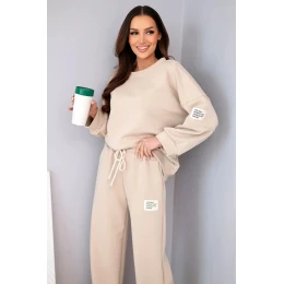 Jemný, mírně elastický materiál s převahou viskózy zajišťuje, že set skvěle padne na postavu a poskytuje komfort nošení po celý den. Mikina má klasický střih s kulatým výstřihem, kalhoty mají elastický pas se šňůrkou a volné nohavice, které zajišťují volnost pohybu.