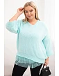 Tento jedinečný dámský komplet se skládá z hrubě pleteného svetru a lehké blůzy s krajkovým zakončením, což je ideální kombinace pohodlí a ženského stylu. Svetr s měkkou, nadýchanou strukturou má výstřih ve tvaru V a volnější střih, který se krásně přizpůsobuje siluetě a zajišťuje komfort nošení. Lehčí blůza pod ním dodává celku jemnost a krajkový spodní lem vytváří elegantní efekt vrstvení.