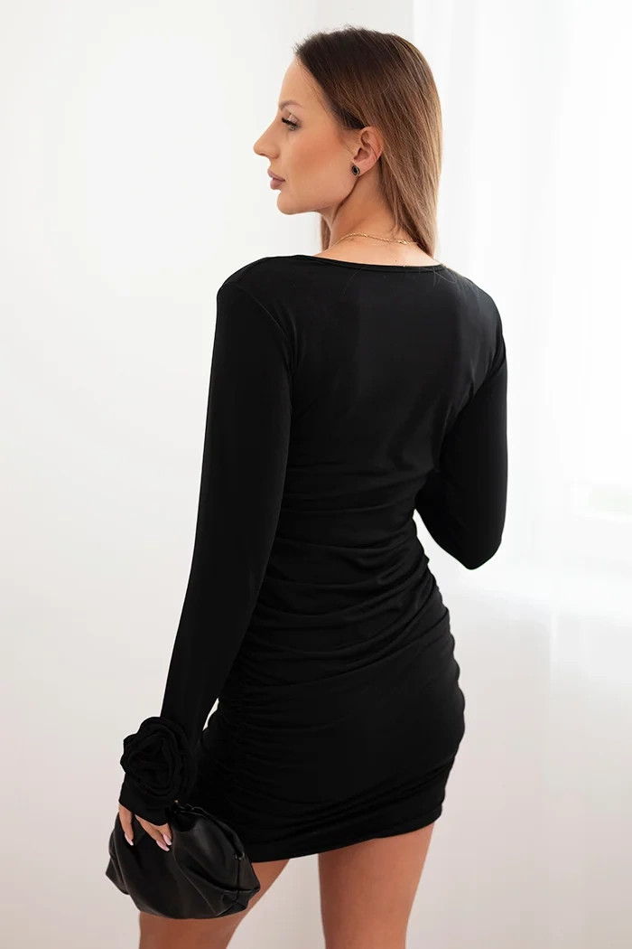 Elegantní dámské mini šaty vyrobené z elastického materiálu s přídavkem viskózy jsou ideální volbou na výjimečné příležitosti. Klasický střih s dlouhým rukávem je obohacen efektním nařasením po celé délce a dekorativními květinami na manžetách, které dodávají ženský šarm.